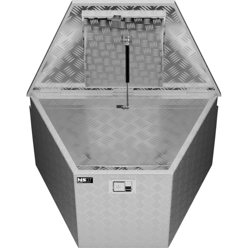 transportiert werden müssen. Die Konstruktion der Kiste besteht aus Aluminium, ist leicht, korrosionsbeständig , langlebig und ungiftig sowie unempfindlich gegenüber den meisten Chemikalien. Sie schützt die Werkzeuge vor Sonneneinstrahlung, Feuchtigkeit und mechanischen Beschädigungen. Die Wände sind 1,3 mm dick . Das große Fassungsvermögen von 150 Litern bietet Platz für viele Gegenstände. Der robuste Deckel verfügt über ein Schlüsselschloss, das den Innenraum schützt. Ein Teleskoparm verhindert das Herabfallen des Deckels. Vernietete Scharniere sorgen für Sicherheit und einfachen Transport.