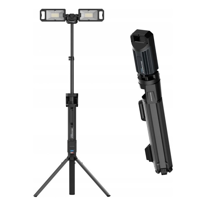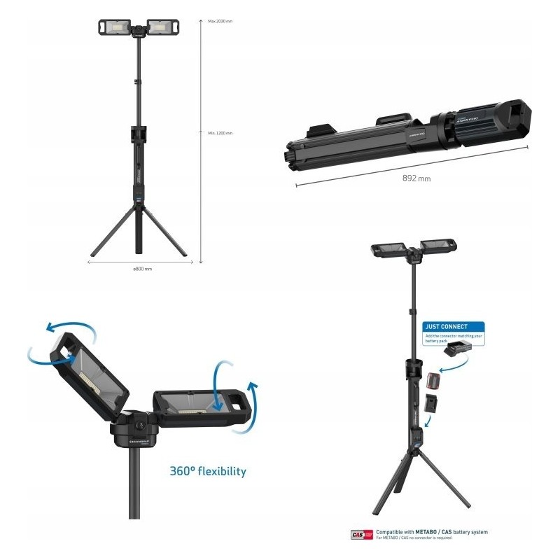 Die um 360° drehbaren Scheinwerfer lassen sich in verschiedene Positionen bringen, um den gewünschten Beleuchtungswinkel zu erzielen, und bieten so ideale Bedingungen für Maler- und Installationsarbeiten. Die Höhe nach dem Ausziehen des Stativs beträgt bis zu 2,3 m. Er verfügt über 2 Lichtstärkestufen (50–100 %), wodurch das Licht an die jeweilige Arbeitsaufgabe angepasst werden kann.