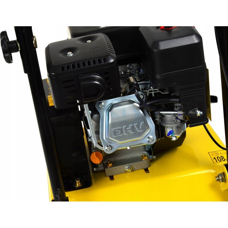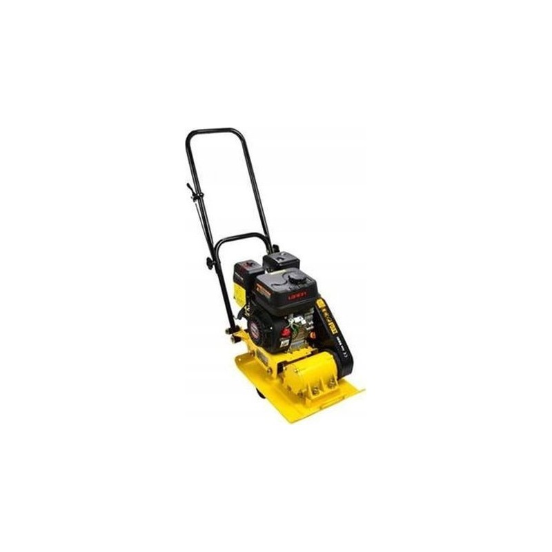 Benzin-Vibrator zur Verdichtung von Untergründen (Boden, Belag) durch Vibration. Das Arbeitselement ist eine Metallplatte, die durch ein vom Verbrennungsmotor angetriebenes Vibrationssystem in Schwingung versetzt wird.