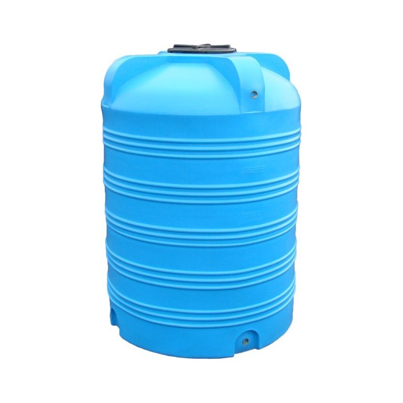 Das vertikale Kunststofffass V-1500 ist ein robuster Lebensmittelbehälter mit einem Fassungsvermögen von 1500 Litern, einer Höhe von 162,5 cm und einem Durchmesser von 118,4 cm, ideal für die Lagerung von Wasser und anderen Lebensmitteln.