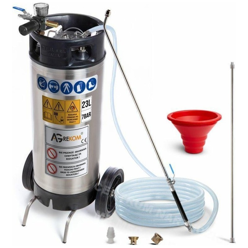 Das Fassungsvermögen des Behälters beträgt 23 Liter, der maximale Betriebsdruck liegt bei 7 bar. Die Reichweite der Materialzufuhr beträgt 15 m.