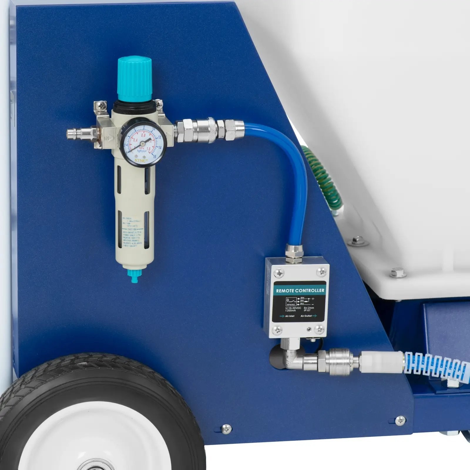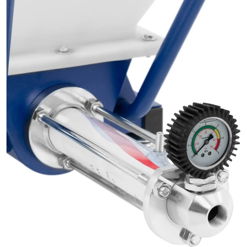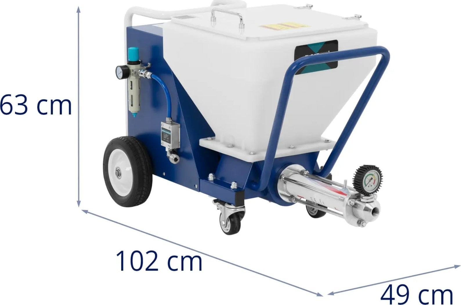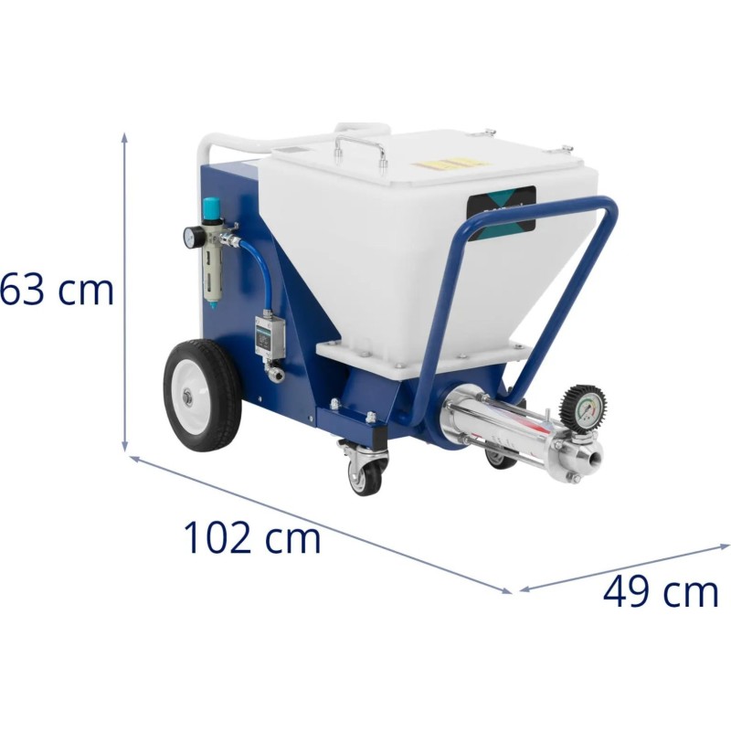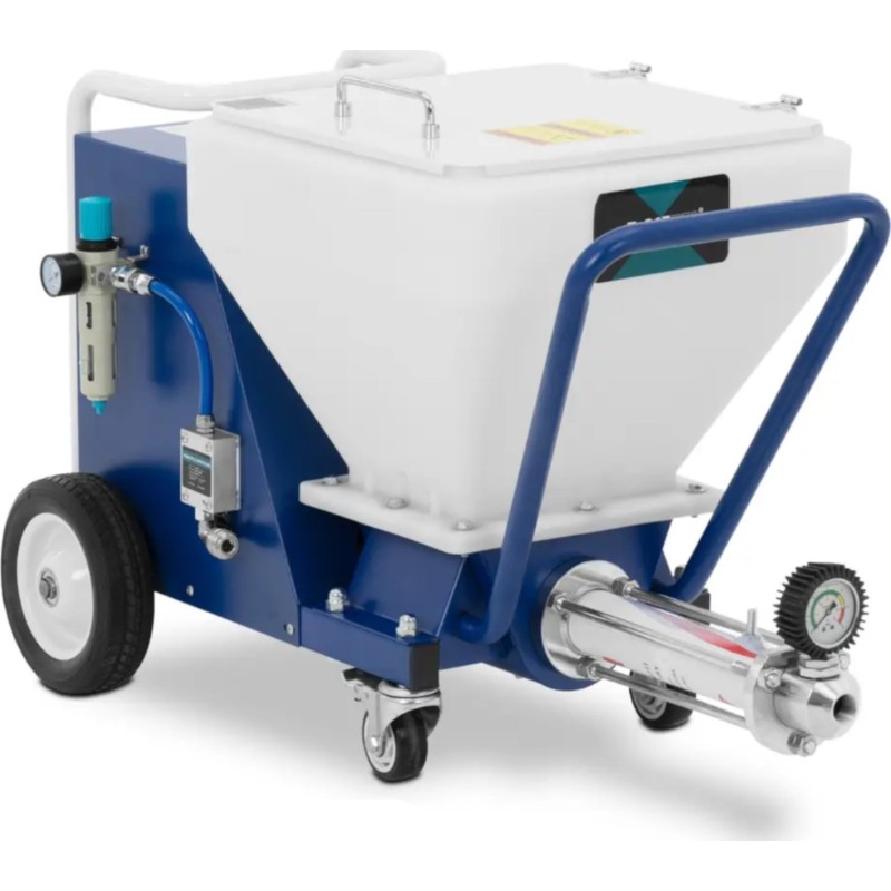 dem Putzspritzgerät der Marke MSW lässt sich Wasserputz auf Gips-, Kalk- oder Zementbasis mühelos an die Wand auftragen. Der Rotor im Gerät sorgt für eine ideale Konsistenz, die mit einem Arbeitsdruck von bis zu 30 bar auf die Wand aufgetragen werden kann. Auf diese Weise haftet der Mörtel an der senkrechten Fläche und bildet eine gleichmäßige Schicht, die nur noch geglättet werden muss. Die Bedienung der Putzmaschine ist äußerst einfach und gewährleistet maximale Bewegungsfreiheit. Es reicht aus, sie an einen Kompressor anzuschließen und den Eingangsdruck mithilfe eines Druckminderers einzustellen. Die Drehrichtung und die Drehzahl des Rotors werden je nach Materialart und der zur Herstellung der Masse verwendeten Wassermenge über ein übersichtliches Bedienfeld eingestellt. Das Gerät erzielt die besten Ergebnisse bei Material mit einer Korngröße von bis zu 3 mm. Der Mischschlauch ist 10 m lang, sodass die Spritzpistole während des Auftragens leicht geführt werden kann. Je nach Art der Masse ist die passende Düse auszuwählen. Hinweis: Für den Betrieb der Maschine ist ein Luftkompressor erforderlich. Je nach Material empfehlen wir einen Kompressor mit einer Leistung von 3 bis 7,5 PS. Der Putzbehälter hat ein Fassungsvermögen von 40 Litern , wodurch sich selbst große Flächen bei einem Durchfluss von 18 l/min ohne lange Unterbrechungen bearbeiten lassen. Der Behälterdeckel sorgt für Sauberkeit während der Arbeit. Vier Rollen ermöglichen einen einfachen Transport der Putzmaschine zum Einsatzort. Die kompakten Abmessungen der Anlage eignen sich ideal für den Einsatz auf Gerüsten. Nach Beendigung der Arbeit lässt sich das Gerät mit Wasser und den mitgelieferten Reinigungskugeln in wenigen Augenblicken leicht reinigen.