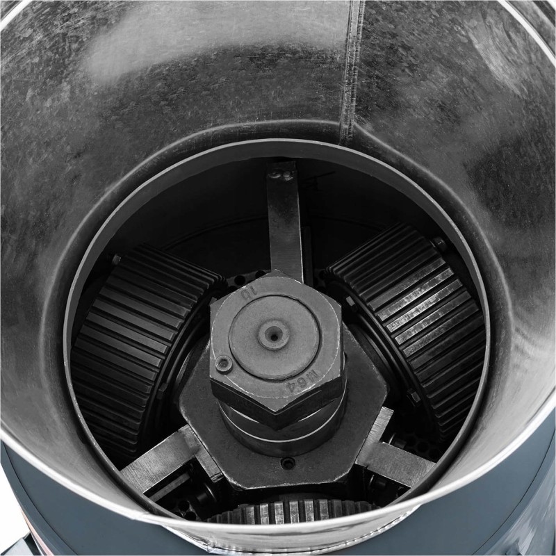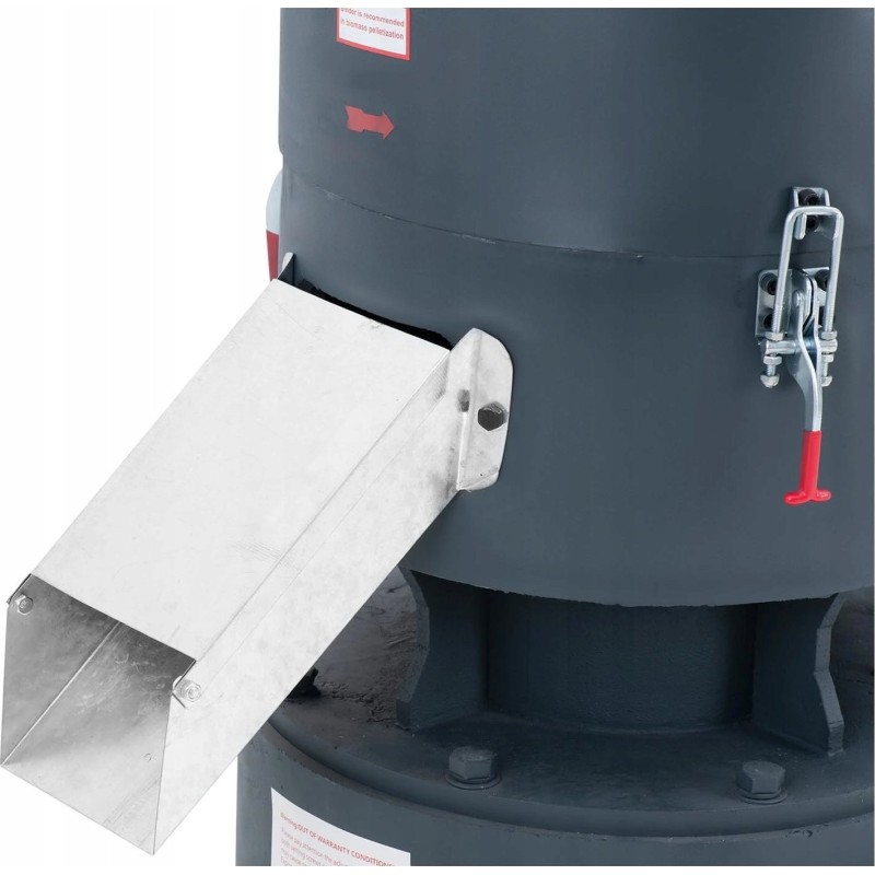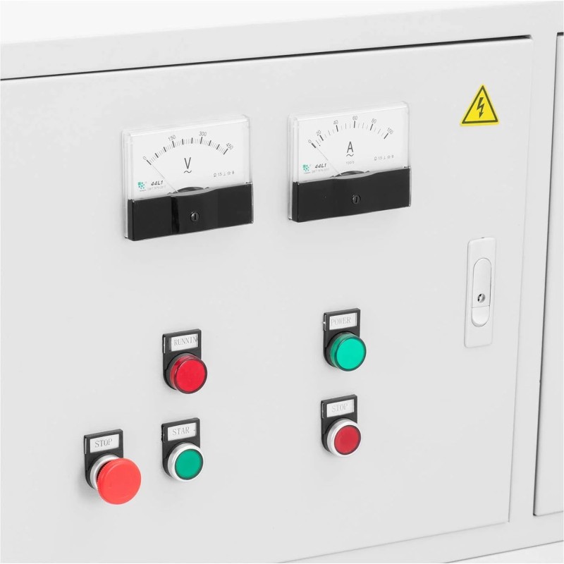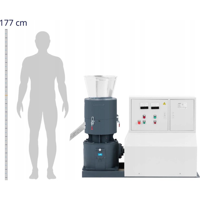 Verwenden Sie die praktische Auswurfschurre, um Säcke direkt mit den fertigen Pellets zu befüllen. Der Schaltschrank ist übersichtlich und intuitiv zu bedienen. Ein Not-Aus-Schalter sorgt für Sicherheit. Die Pelletpresse verfügt über einen Elektromotor mit einer Leistung von W. Das Gerät wird mit 3-Phasen-Strom 400 V betrieben und wird ohne Anschlussstecker geliefert.