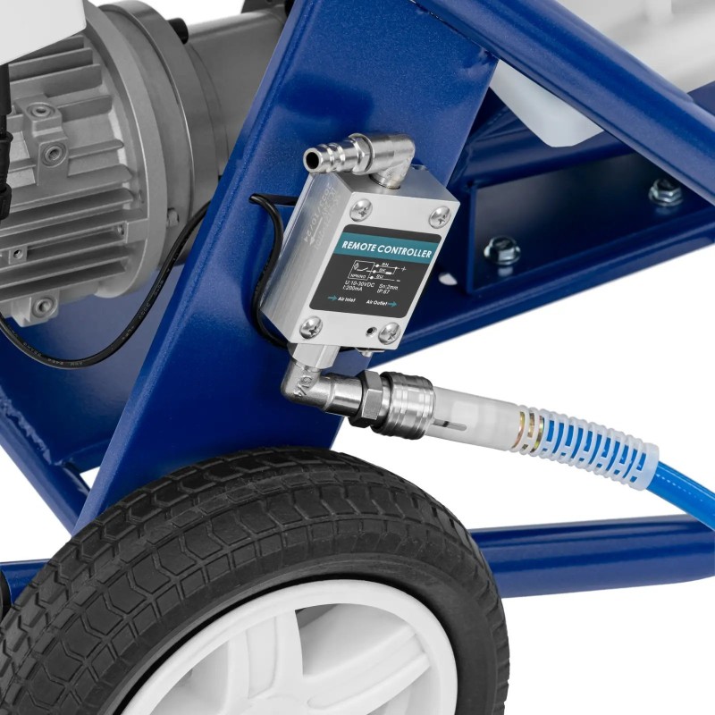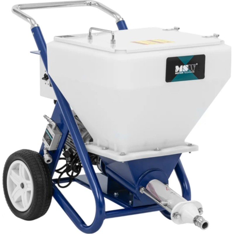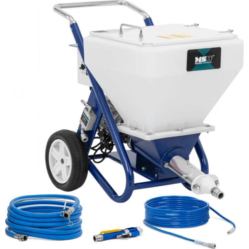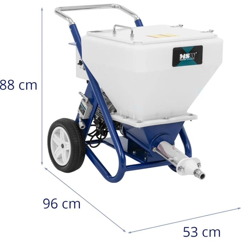 der Putzmaschine der Marke MSW lässt sich Wasserputz auf Gips-, Kalk- oder Zementbasis mühelos auf die Wand auftragen. Der Rotor im Gerät sorgt für eine ideale Konsistenz, die mit einem Arbeitsdruck von bis zu 20 bar auf die Wand aufgetragen wird. Auf diese Weise haftet der Mörtel an der senkrechten Fläche und bildet eine gleichmäßige Schicht, die nur noch geglättet werden muss. Die Bedienung der Putzmaschine ist äußerst einfach und gewährleistet maximale Bewegungsfreiheit. Schließen Sie sie an einen Kompressor an und stellen Sie den Eingangsdruck mithilfe eines Druckminderers ein. Die Drehrichtung und Drehzahl des Rotors werden über ein übersichtliches Bedienfeld je nach Materialart und der zur Herstellung der Masse verwendeten Wassermenge eingestellt. Das Gerät erzielt die besten Ergebnisse bei Materialien mit einer Korngröße von bis zu 6 mm. Der Mischschlauch ist 7,5 m lang, sodass die Spritzpistole während des Auftragens leicht geführt werden kann. Je nach Art der Masse ist die passende Düse auszuwählen. Hinweis: Für den Betrieb der Maschine ist ein Luftkompressor erforderlich. Je nach Material wird ein Kompressor mit einer Leistung von 3 bis 7,5 PS empfohlen. Der Putzbehälter hat ein Fassungsvermögen von 40 Litern. Das bedeutet, dass mit dem Putzaggregat auch große Flächen bei einem Durchfluss von 15 l/min ohne lange Unterbrechungen bearbeitet werden können. Der Behälterdeckel sorgt für Sauberkeit während der Arbeit. Dank der beiden Rollen lässt sich die Maschine leicht zum Einsatzort transportieren. Die kompakten Abmessungen der Maschine eignen sich ideal für den Einsatz auf Gerüsten. So lassen sich auch höhere Wandabschnitte erreichen. Nach Beendigung der Arbeit sollte das Gerät mit Wasser und den mitgelieferten Reinigungskugeln gereinigt werden.