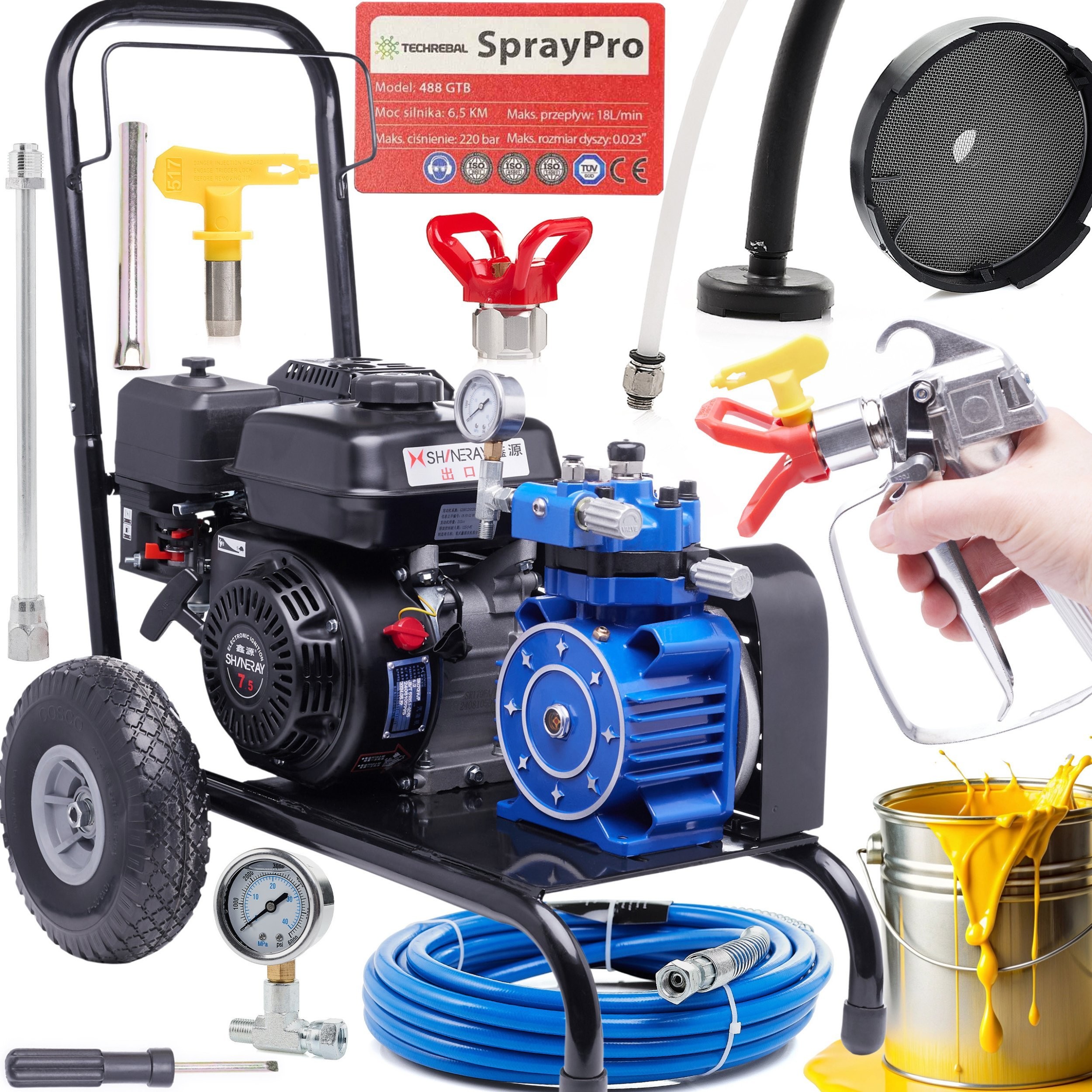 Das benzinbetriebene Membran-Farbspritzgerät 488 GTB ist eine hervorragende Lösung sowohl für Profis als auch für anspruchsvolle Privatanwender. Mit einer Leistung von 6,5 PS und einer Spritzleistung von bis zu 18 l/min meistert dieses Gerät selbst die anspruchsvollsten Lackieraufgaben. Dank seiner soliden Konstruktion und der hochwertigen Verarbeitung garantiert dieses Gerät Zuverlässigkeit und eine lange Lebensdauer.