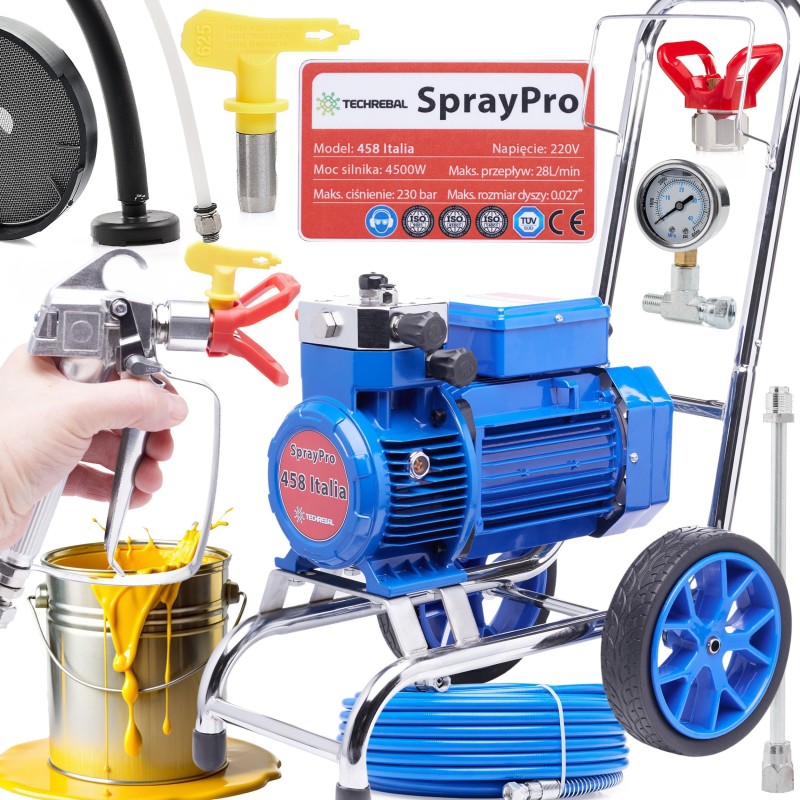 Das Gerät erreicht eine beeindruckende Leistung von bis zu 28 l/min, was es zur idealen Wahl für große Lackierprojekte macht. Der 4500-W-Motor sorgt für hohe Leistung, und der maximale Arbeitsdruck von 230 bar ermöglicht das Lackieren selbst unter schwierigen Bedingungen.