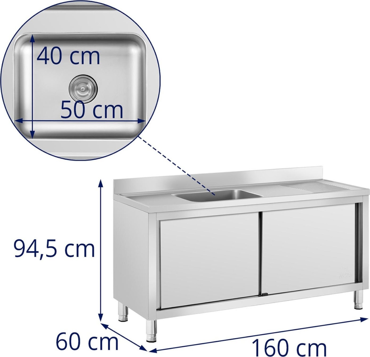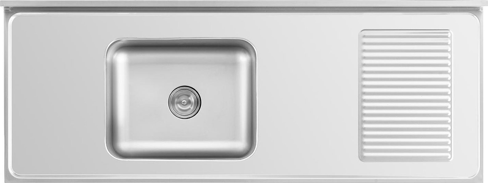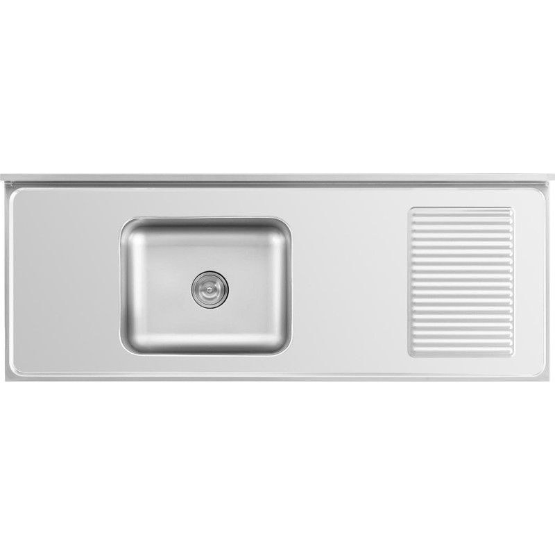Die Spüle mit den Maßen 500 x 400 x 240 mm befindet sich auf der linken Seite des Schranks . Sie eignet sich hervorragend zum Spülen von tiefen Töpfen oder Backblechen. Hohe Wände schützen die Umgebung vor Spritzwasser. Im Abfluss befindet sich ein Sieb , das verhindert, dass die Rohre durch Speisereste verstopfen. Die glatten Oberflächen sorgen für eine einfache Reinigung. Die abgerundeten Kanten des Schranks garantieren eine sichere Nutzung. Eine 100 mm hohe Aufkantung schützt die Wand hinter dem Möbel vor Verschmutzungen. Unter der Spüle befindet sich ein großer Schrank mit Schiebetüren , in dem die wichtigsten Küchenutensilien Platz finden. Die Höhe der Füße ist verstellbar.