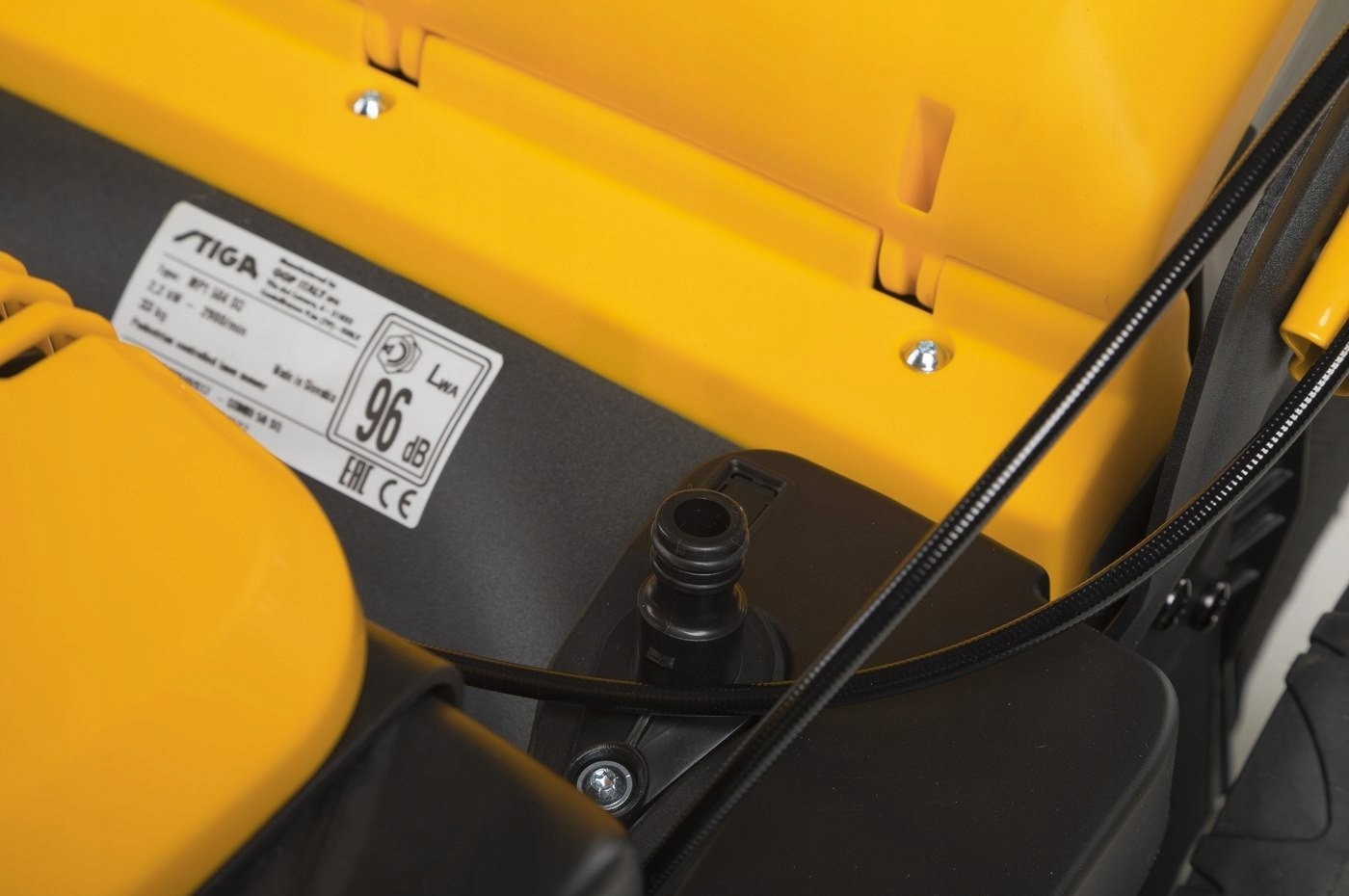 Das Gehäusereinigungssystem ermöglicht eine schnelle und einfache Reinigung des Mäherinneren – schließen Sie einfach einen Gartenschlauch mit Wasser an den Schnellanschluss am Mähergehäuse an und starten Sie den Motor. Die Reinigung erfolgt während der Rotation des Messers, wodurch ein starker Wasserstrahl auf dessen Oberfläche gerichtet werden kann.