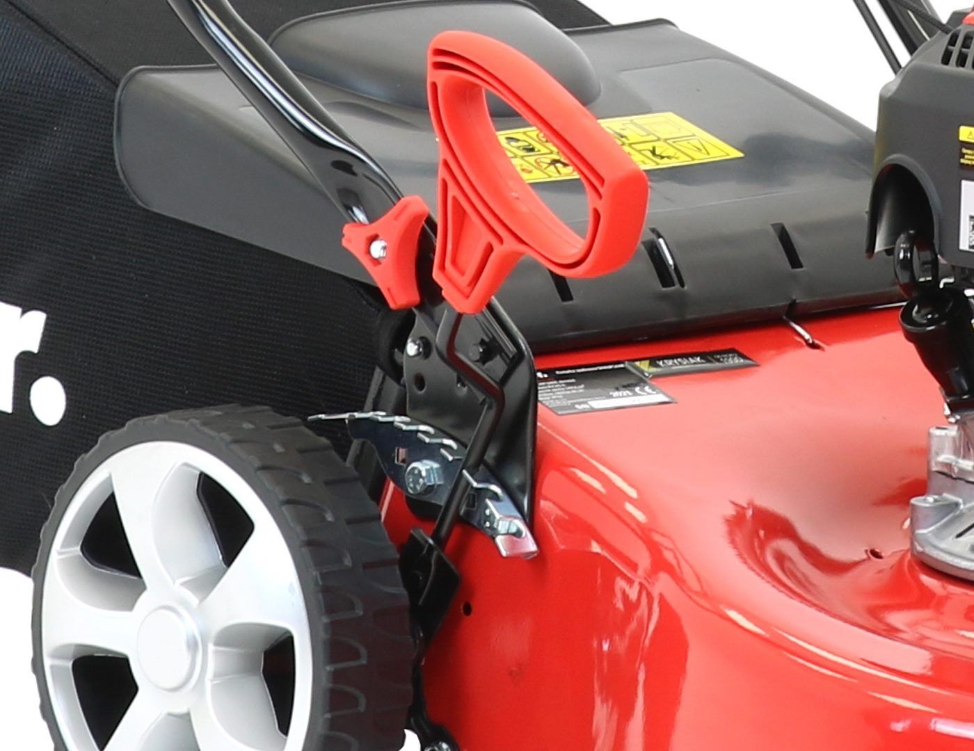 Dank der zentralen Höhenverstellung lässt sich die Schnitthöhe mit einem Handgriff bequem ändern – zentral und stufenlos dank eines Federmechanismus.