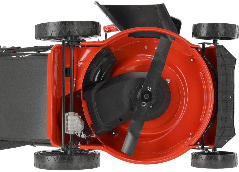 Der Rasenmäher wurde für eine einfache Manövrierbarkeit konzipiert, was durch die großen Räder ermöglicht wird. Sie ermöglichen eine freie Bewegung auf unebenem Gelände und an schwer zugänglichen Stellen.