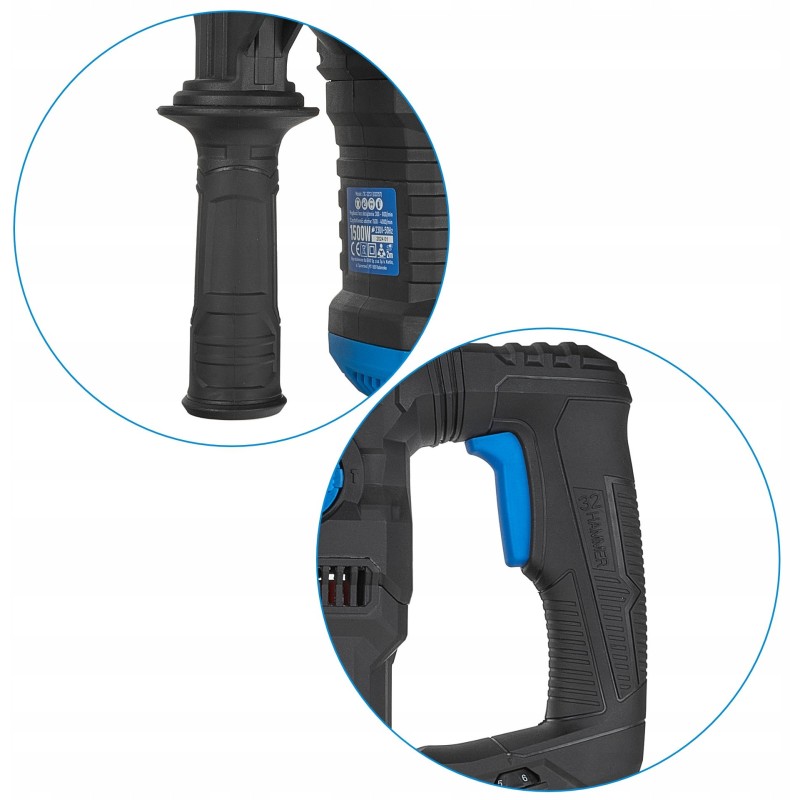 Mit einer Leistung von 1500 W und einer Schlagenergie von 6 J bietet der Bohrhammer eine hervorragende Leistung. Die Drehzahlregelung im Bereich von 300 bis 800 U/min und die Schlagfrequenz von 1500 bis 4000 Schlägen/min ermöglichen die volle Kontrolle über das Werkzeug, was bei der Arbeit mit unterschiedlichen Materialien entscheidend ist.