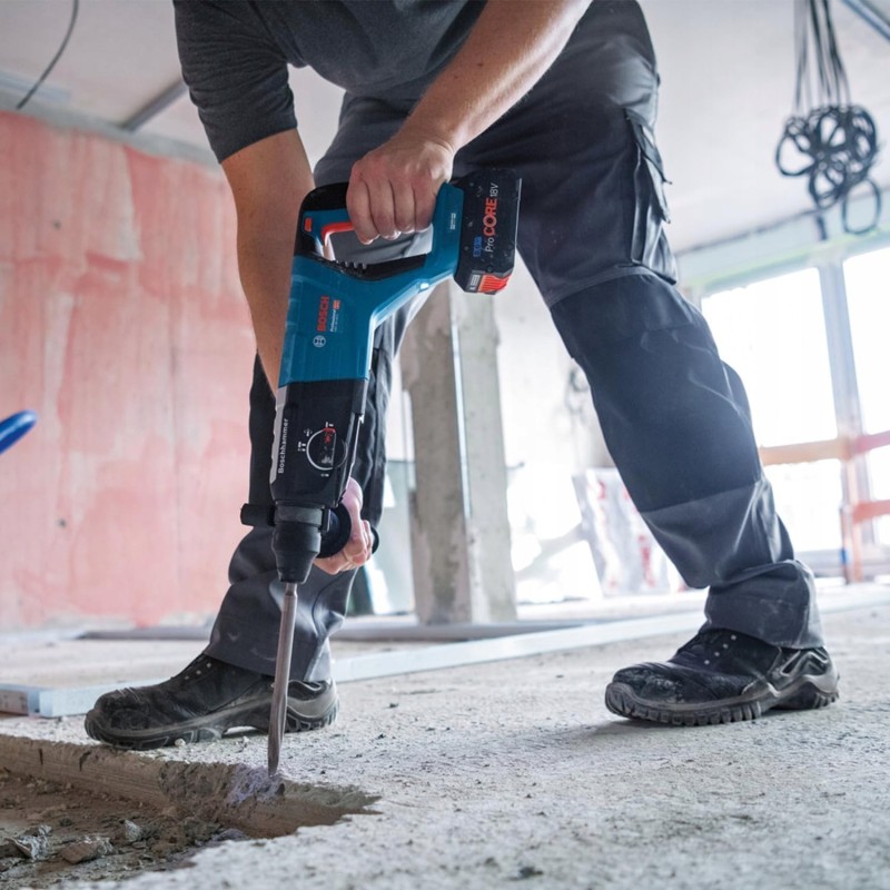 Der Bosch-Schlaghammer wird akkubetrieben, was für komfortablen Einsatz ohne Einschränkungen durch Kabel sorgt. Die Spannung von 18 V garantiert eine kraftvolle und stabile Leistung des Werkzeugs.