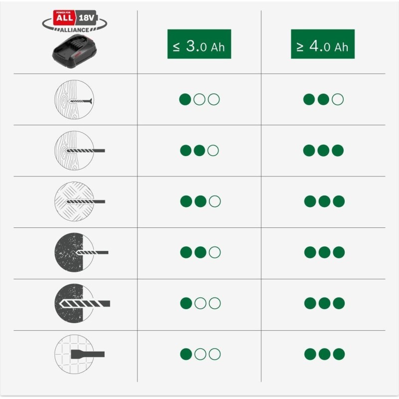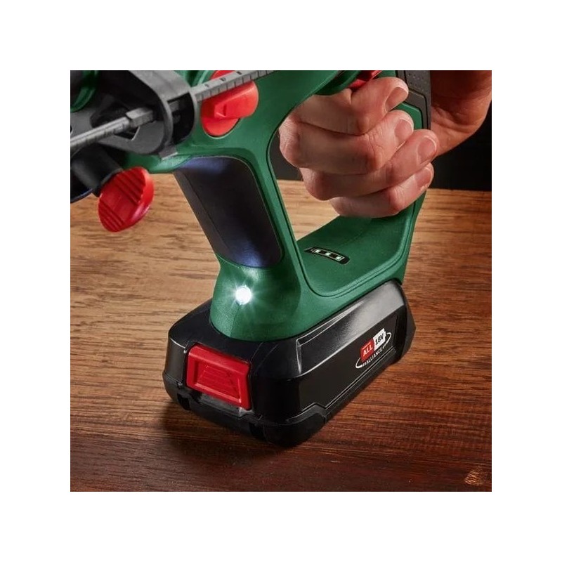 Der Bosch UniversalHammer 18V ist mit einem pneumatischen Schlagwerk mit einer Energie von 2 J ausgestattet, was das Bohren in Beton bis zu 16 mm und in Holz bis zu 25 mm ermöglicht. Damit meistert das Werkzeug auch die schwierigsten Bedingungen.