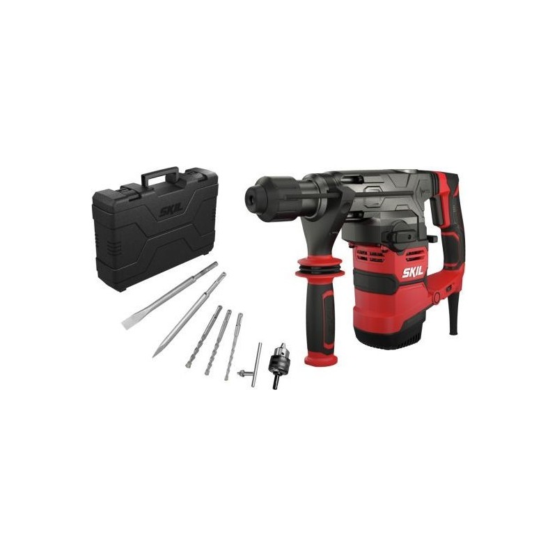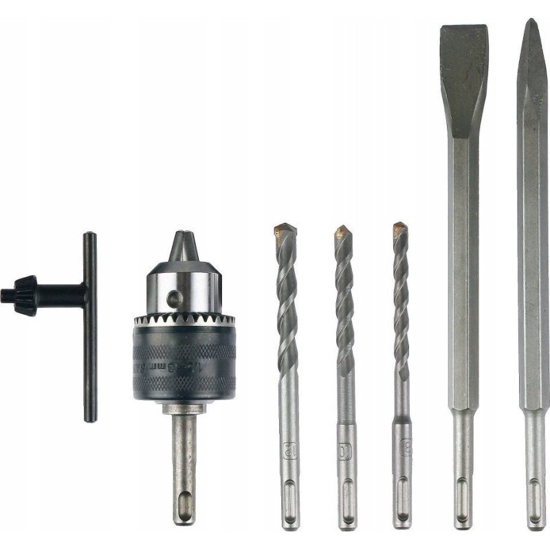 Zum Standardlieferumfang gehören der Bohrhammer, ein stabiler Koffer, SDS+-Bohrer (8, 10, 12 mm), ein Spitzmeißel sowie ein Flachmeißel, ein SDS+-Adapter mit 13-mm-Bohrfutter, ein vibrationsdämpfender Seitengriff und ein Bohrtiefenanschlag. Damit hat der Anwender alles, was er braucht, um sofort nach dem Kauf mit der Arbeit zu beginnen.