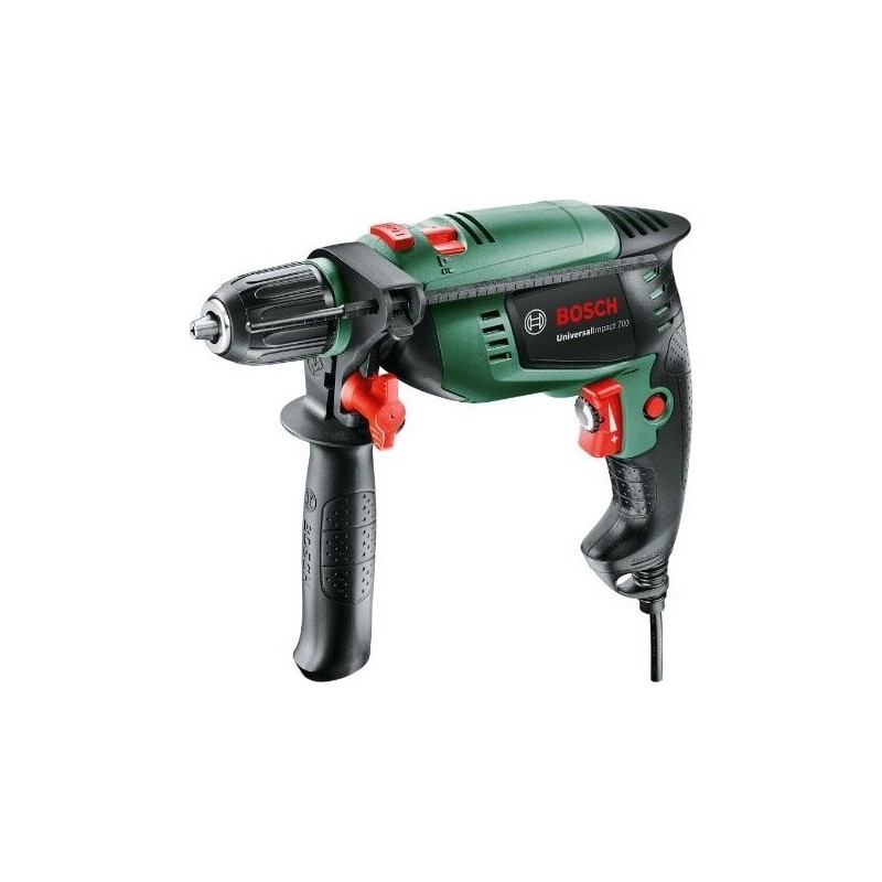 Bosch UniversalImpact 700. Spannart: Zentralverriegelung, Schutzklasse: II. Maximale Spannweite: 1,3 cm, Leerlaufdrehzahl (max.): 3000 U/min, Bohrerdurchmesser in Holz (max.): 3 cm. Stromversorgung: Wechselstrom, Leistungsaufnahme: 701 W, Wirkleistung: 530 W. Produktgewicht: 1,7 kg