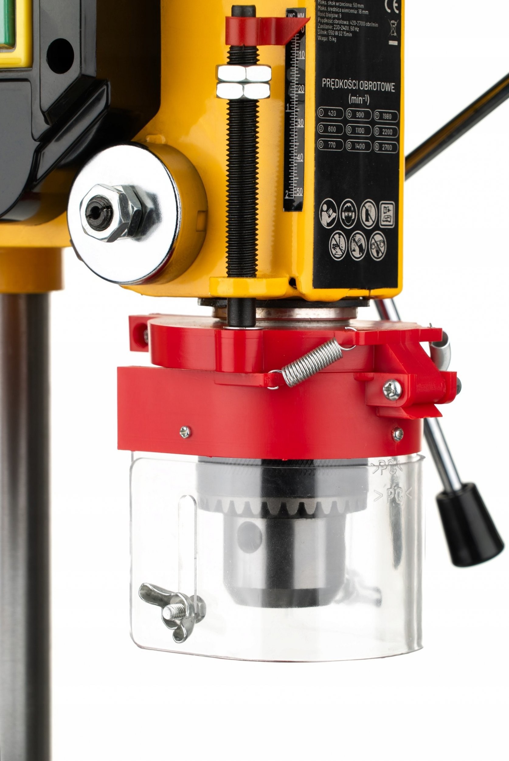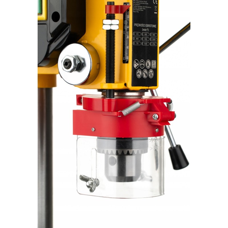 Die Bohrmaschine wurde mit Blick auf die Sicherheit des Benutzers entwickelt. Ausgestattet mit einer transparenten, höhenverstellbaren Schutzhaube bietet sie zusätzlichen Schutz während der Arbeit. Das ergonomische Design und die robuste Konstruktion sorgen für eine komfortable und sichere Handhabung des Werkzeugs.