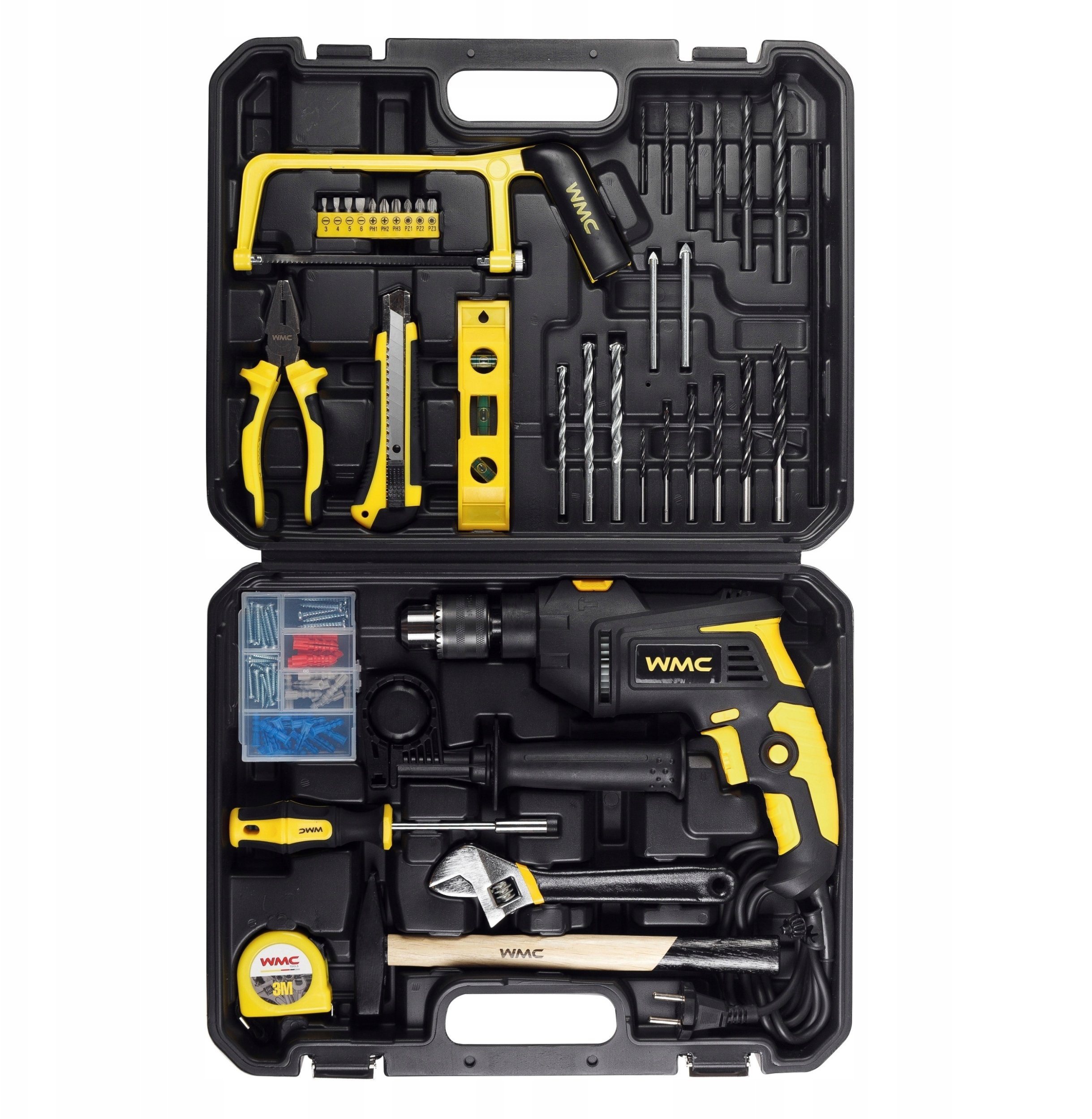 • Lieferumfang: Bohrmaschine, Bohrer für Metall, Beton, Keramikfliesen, Holz, Bits, Zange, Wasserwaage, Metallsäge, Messer, Schraubenschlüssel, Hammer, Maßband, Befestigungselemente, Koffer