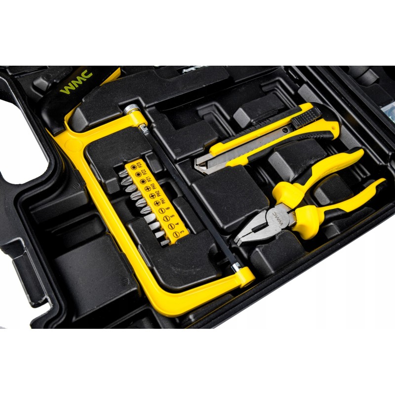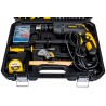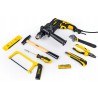 Das Set enthält nicht nur eine Bohrmaschine, sondern auch eine große Auswahl an Werkzeugen, mit denen Sie sofort nach dem Kauf mit der Arbeit beginnen können. Im Set befinden sich unter anderem eine Universalzange, eine Wasserwaage, eine Metallsäge, ein Klappmesser, ein Schraubenschlüssel, ein Hammer sowie ein Rollmaßband. Damit hat der Benutzer alles, was für die erfolgreiche Ausführung der Aufgaben erforderlich ist.