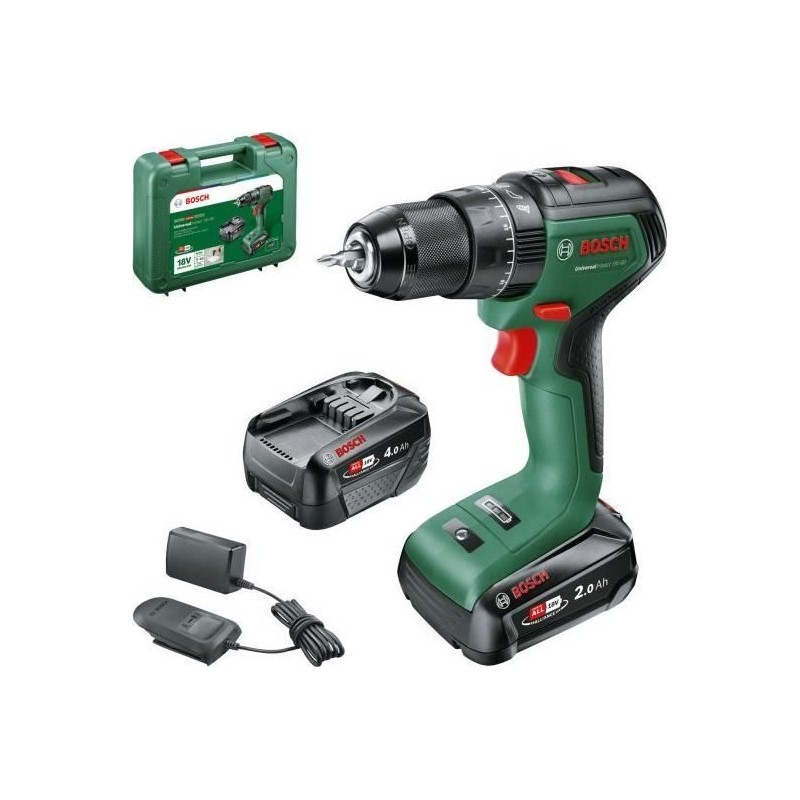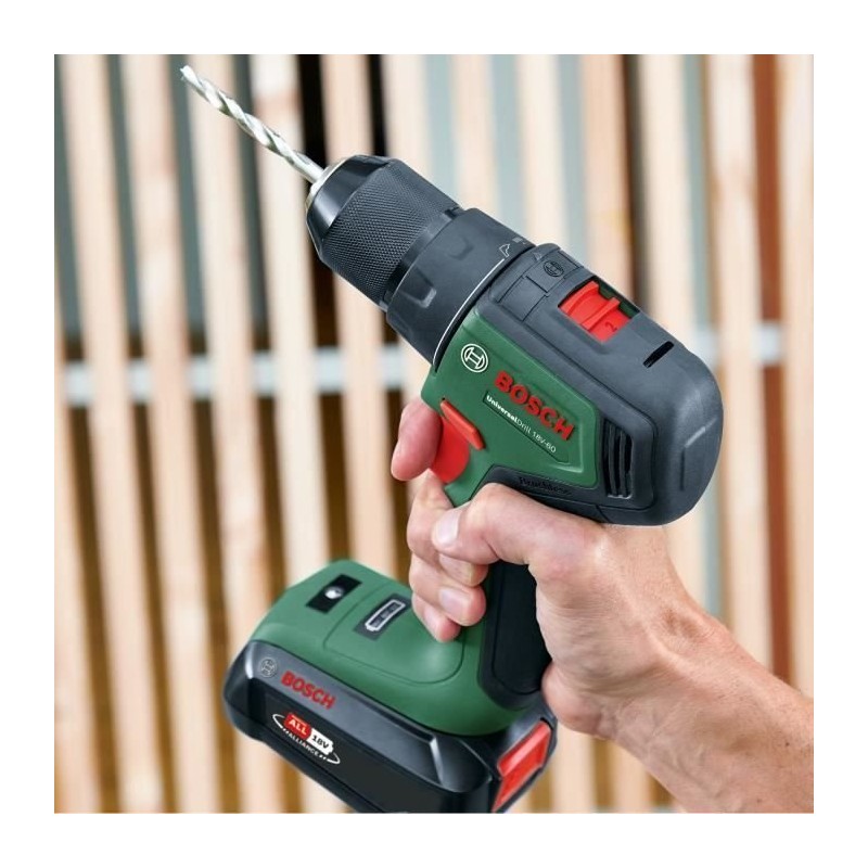 Die Bosch Universal Impact 18V-60 wird mit Lithium-Ionen-Akkus mit einer Spannung von 18 V und einer Kapazität von 1,5 Ah betrieben. Im Lieferumfang sind zwei Akkus enthalten, was einen längeren Einsatz des Werkzeugs ohne häufiges Aufladen ermöglicht.