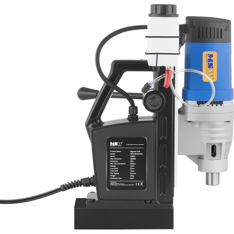 Die MSW-Magnetbohrmaschine ermöglicht dank ihrer Konstruktion den Einsatz unter schwierigen Bedingungen und in verschiedenen Positionen, z. B. vertikal. Dies wird durch einen starken Elektromagneten mit einer Kraft von 11.500 N ermöglicht, der das Gerät in einer stabilen Position hält. Das relativ geringe Gewicht und das lange Netzkabel (2 m ) ermöglichen es, die Bohrmaschine an jedem beliebigen Ort aufzustellen. Der Koffer erleichtert den Transport des gesamten Sets. Für eine