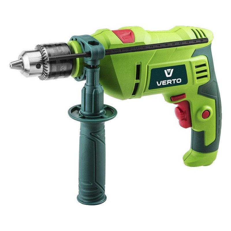 500-W-Schlagbohrmaschine mit 13-mm-Schlüsselhalter. Sie verfügt über Bohr- und Schlagbohrfunktionen. Die Leistung von 500 W ermöglicht das Bohren von Löchern mit einem Durchmesser von bis zu 20 mm in Holz, 13 mm in Beton und 10 mm in Stahl. Die Bohrmaschine verfügt über einen Umschalter für Rechts-/Linkslauf, eine stufenlose Drehzahlregelung sowie eine Dauerbetriebssperre. Sie ist mit einem langen Anschlusskabel ausgestattet, das eine freie Handhabung des Werkzeugs ermöglicht. Der ergonomische Griff erhöht den Komfort und die Arbeitssicherheit. Im Lieferumfang enthalten sind ein zusätzlicher Seitengriff sowie ein Bohrtiefenanschlag. Die Konformität mit den europäischen Sicherheitsstandards wird durch das CE-Zertifikat gewährleistet. Die Marke VERTO bietet ein Sortiment an Elektrowerkzeugen und Zubehör für jeden Heimwerker.