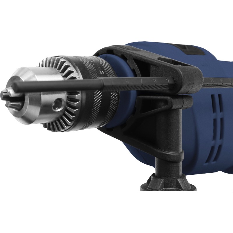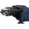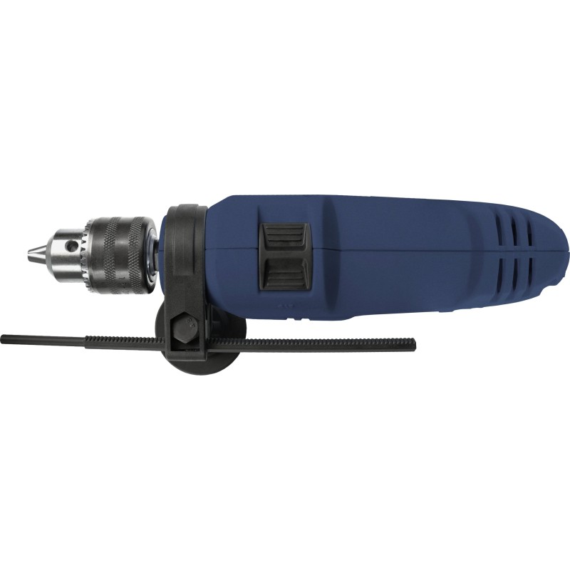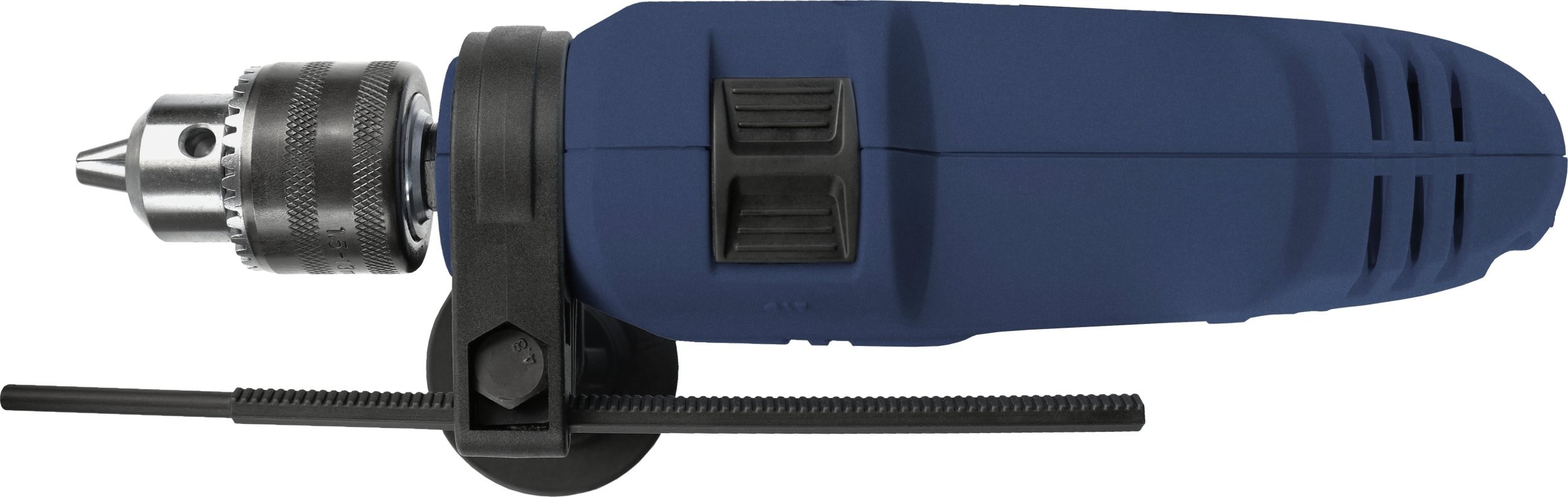 Die einstufige Schlagbohrmaschine CELMA Professional PRCk 13GEO ist zum Bohren von Löchern in Metall, Holz und Kunststoffen – bei Drehbewegung der Spindel – sowie zum Bohren von Löchern in Baumaterialien – bei Dreh-Schlagbewegung der Spindel. Zur Einstellung der entsprechenden Betriebsart dient der Betriebsartenschalter, der sich oben am Gehäuse der Bohrmaschine befindet. Die Bohrmaschine PRCk 13GEO kann auch zum Eindrehen und Herausdrehen von Schrauben und Bolzen mit einem maximalen Durchmesser von 6 mm verwendet werden. Die Anpassung der Drehzahl an die jeweilige Arbeit erfolgt stufenlos über einen elektronischen Drehzahlregler, der mit dem Schaltertaster kombiniert ist. Die Drehrichtung der Spindel lässt sich durch Einstellen des Hebels über dem Schaltertaster in die entsprechende Position ändern. Der ergonomisch geformte Hauptgriff sowie der Zusatzgriff, der im vorderen Teil der Bohrmaschine festgeklemmt werden kann, sorgen dafür, dass die Bohrmaschine während der Arbeit sicher in den Händen gehalten werden kann. In der Halterung des Zusatzgriffs kann ein Anschlag zur Festlegung der Bohrtiefe befestigt werden. Die Bohrmaschine CELMA Professional PRCk 13GEO ist mit folgendem Zubehör ausgestattet: