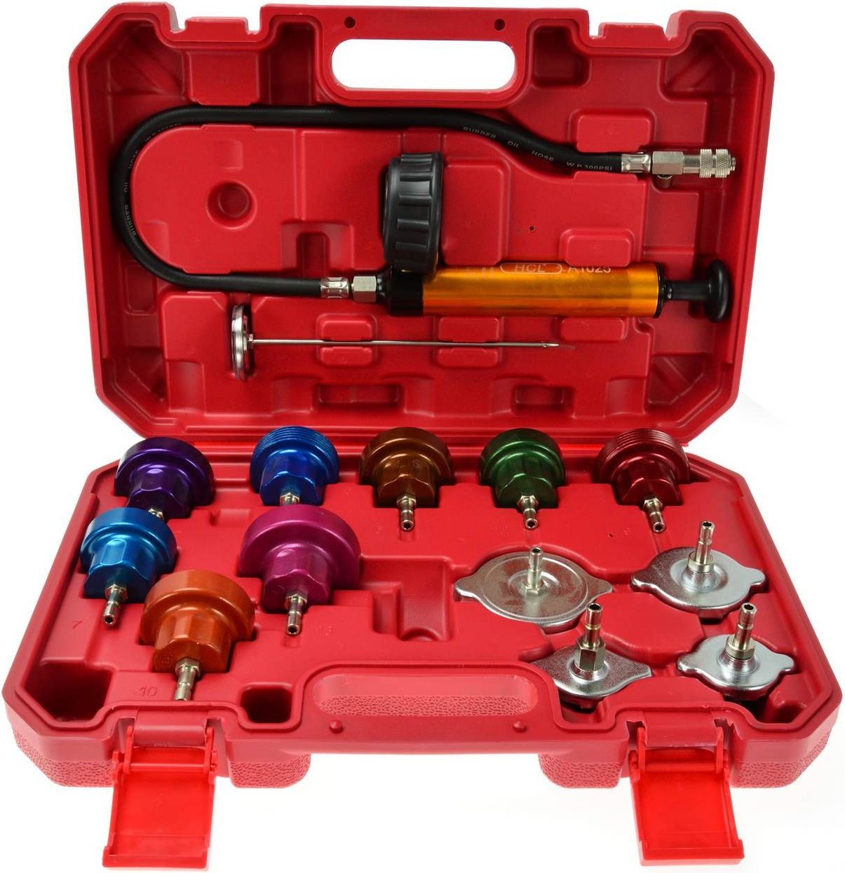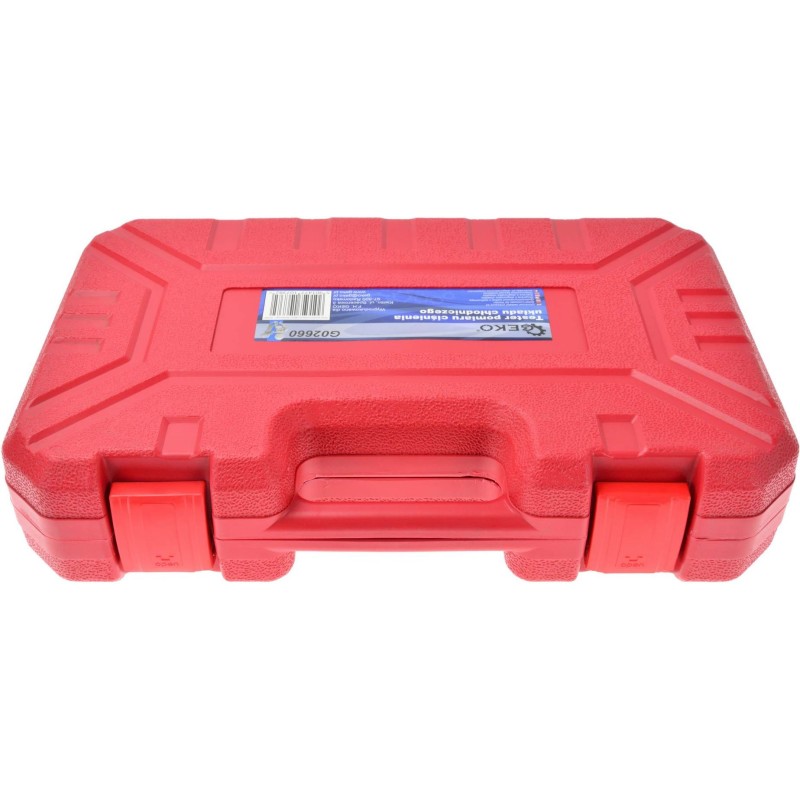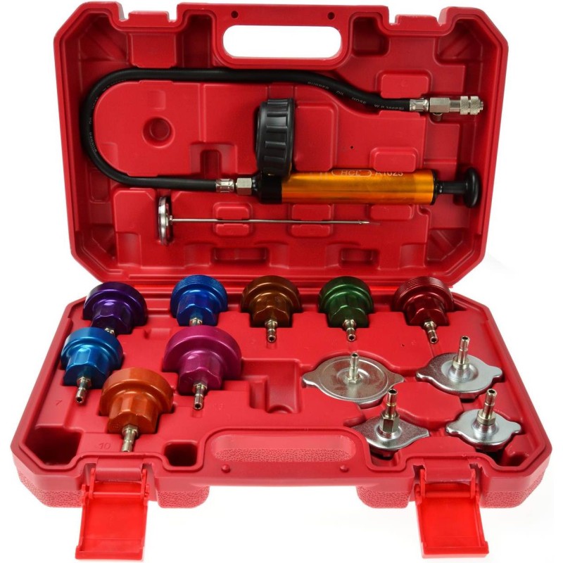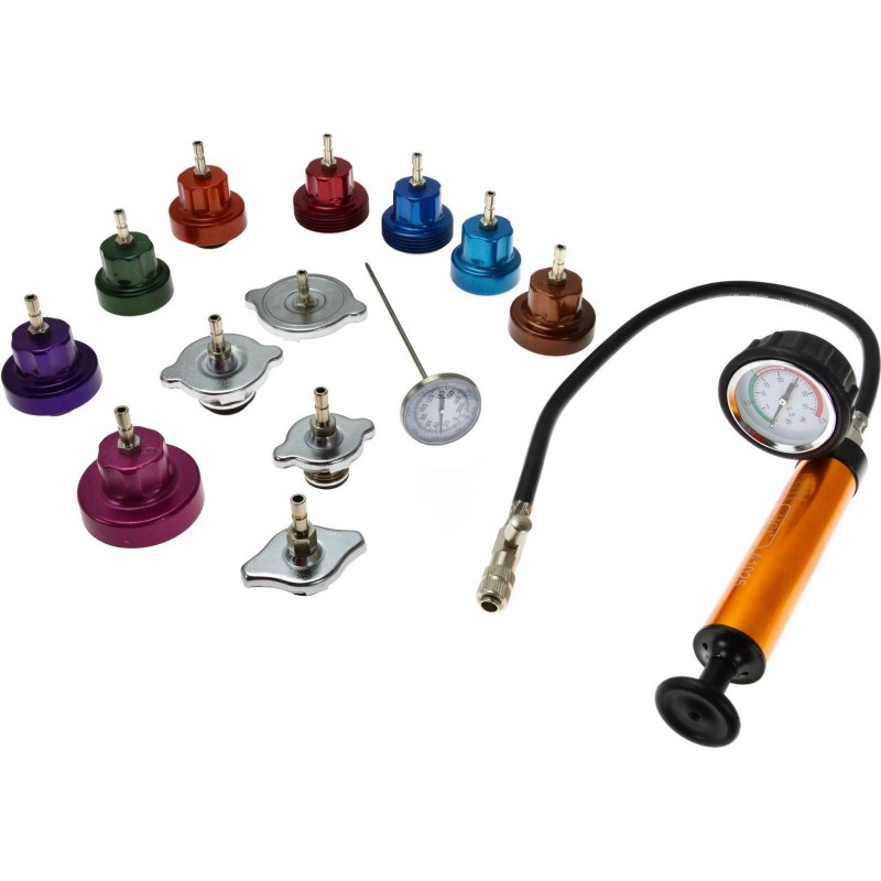 Der Tester dient zur Lokalisierung von Undichtigkeiten im Kühlsystem. Robuste Handpumpe mit leichtgängigem Betrieb und gut ablesbarer Manometerskala. Im Lieferumfang sind außerdem 12 Adapter für verschiedene Automarken sowie ein Thermometer enthalten. Anwendungsbereich: Alfa Romeo, Audi, BMW, Citroën, Fiat, Ford, Isuzu, Jaguar, Jeep, Lexus, Mazda, Mercedes, Mitsubishi, Nissan, Peugeot, Renault, Rover, Saab, Subaru, Suzuki, Toyota, Vauxhall/Opel, Volvo, VW