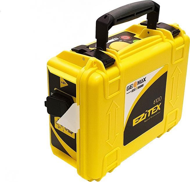 Der Generator Geomax EziTex t100 erzeugt ein elektrisches Signal in Form von Strom in einem Metallkabel, wodurch das Kabel von einem Detektor, der auf derselben Frequenz arbeitet, erkannt und identifiziert werden kann. Der Einsatz des Detektors in Verbindung mit dem Generator ermöglicht eine genauere Ortung sowie die Bestimmung der Tiefe. Betriebsmodi des Generators EziTex t100 induktiv (ohne Anschluss) – Einsatz hauptsächlich an unter Spannung stehenden Kabeln galvanisch (mit Anschluss) – Einsatz an Metallinstallationen und Kabeln (Signalkabel mit Klemme – optionales Zubehör) Es gibt drei Betriebsmodi: 33-kHz-Modus für den Einsatz in normalem Gelände 8-kHz-Modus für den Einsatz bei anderen Anlagen. Der gemischte Modus 8 und 33 kHz (nur im galvanischen Modus) ist in Bereichen mit dicht verlegten Leitungen nützlich, wo sowohl der 8- als auch der 33-kHz-Modus bessere Detektionsergebnisse liefern können. Die besten Detektionsergebnisse lassen sich erzielen, indem man die Modi (Betriebsfrequenzen) am Detektor umschaltet. Fragen Sie nach weiteren Informationen unter Tel. 56 306 61 00