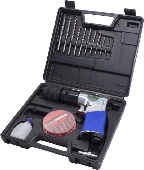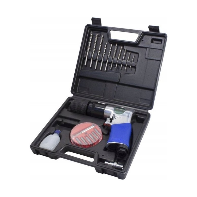 Handliche Druckluftbohrmaschine mit Rechts-/Linkslauf und Schnellspannbohrfutter. Komplett mit Bohrern und Bits im praktischen Koffer.