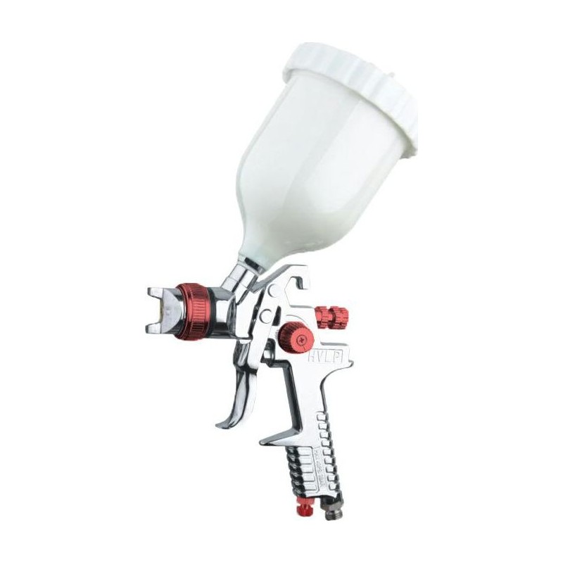 Das Modell GT-828 HVLP ist eine professionelle Niederdruck-Lackierpistole. Fortschrittliche Konstruktion von Pistole und Düse. Die Pistole ist mit einem oberen, schwerkraftgespeisten Kunststoffbehälter mit einem Fassungsvermögen von 600 ml ausgestattet.