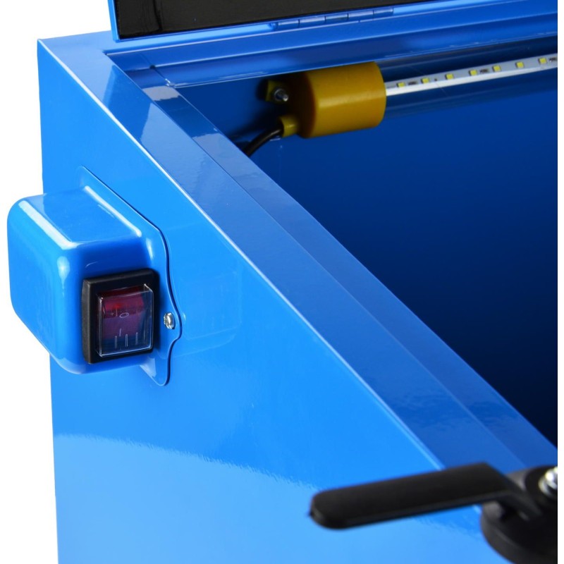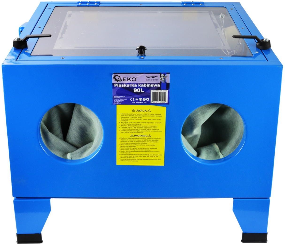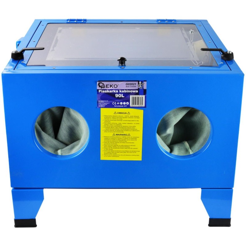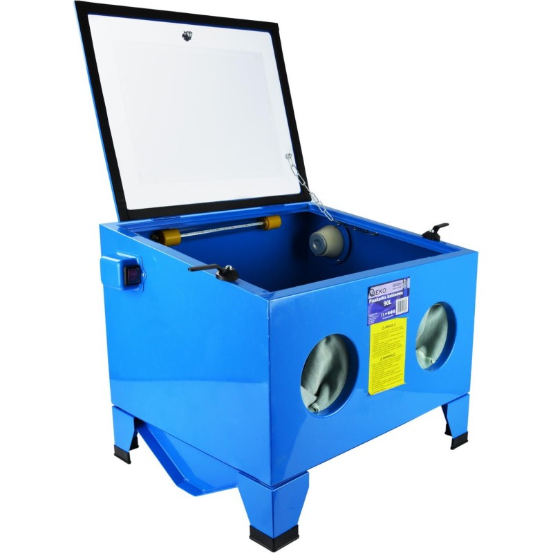 Kabinen-Sandstrahlgerät mit einem Fassungsvermögen von 90 Litern, ausgelegt für den geschlossenen Strahlmittelkreislauf. Das ideale Gerät zum Sandstrahlen kleiner Gegenstände. Die Maschine verfügt über eine robuste Kammer mit einer nach oben klappbaren Klappe, eine Sandstrahlpistole, vier Keramikdüsen, hochwertige Arbeitshandschuhe, eine Beleuchtung des Arbeitsbereichs sowie ein großes Sichtfenster. Kompakte Bauweise und großer, geräumiger Arbeitsbereich. Außergewöhnliche Benutzerfreundlichkeit, Zuverlässigkeit und Arbeitssicherheit. Der staubfreie Betrieb des Geräts wird durch den Einsatz von Rundumdichtungen gewährleistet. Die Auslassöffnung ermöglicht einen schnellen Wechsel des Strahlmittels. Produktmerkmale: Strahlpistole mit 4 austauschbaren Keramikdüsen, großes Sichtfenster mit austauschbarer Schutzfolie, Beleuchtung – 12-V-Leuchtstofflampe; die Ablassöffnung ermöglicht einen schnellen Wechsel des Strahlmittels; in das Gerät integrierte Gummihandschuhe; stabiler Gitterrost im Arbeitsbereich; rutschfeste Gummifüße an den Gerätebeinen. Technische Daten Spannung: 230 V Arbeitsvolumen der Kabine: 90 Liter Größen der Sandstrahldüsen: 4, 5, 6, 7 mm Betriebsdruck: 5–7 bar Fensterabmessungen: 485 x 390 mm Innenbreite der Kabine: 580 mm Innentiefe der Kabine: 485 mm Innenhöhe hinten in der Kabine: 355 mm Innenhöhe vorne in der Kabine: 305 mm Gesamtbreite der Sandstrahlmaschine: 630 mm Gesamthöhe der Sandstrahlmaschine: 500 mm Gesamttiefe der Sandstrahlmaschine: 495 mm Lieferumfang Sandstrahlpistole, Absaugschlauch für Strahlmittel, Luftschlauch mit Anschlussstutzen, 4 Keramikdüsen – 4, 5, 6, 7 mm Netzteil für 12-V-Lampe mit Anschluss an 230-V-Netz 4 Ersatzfolien zum Schutz des Sichtfensters 2 große, in die Kabine integrierte Arbeitshandschuhe aus Latex Teflonband zum Abdichten