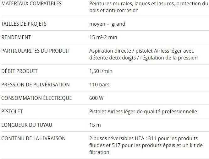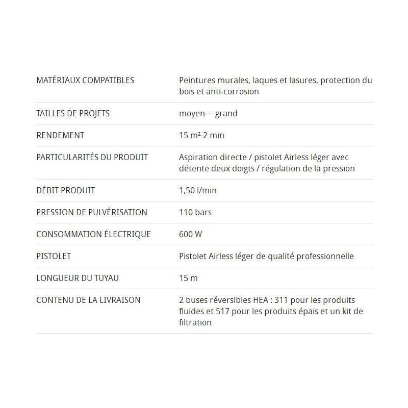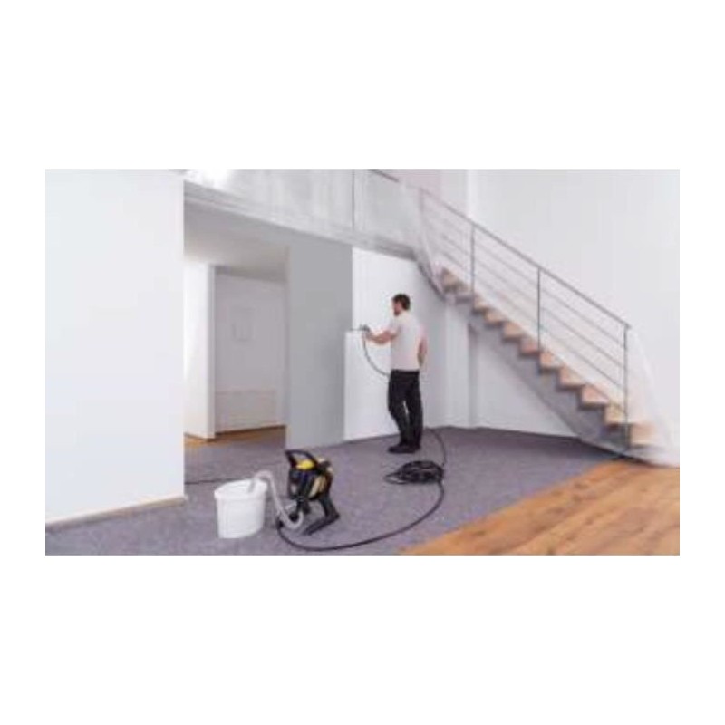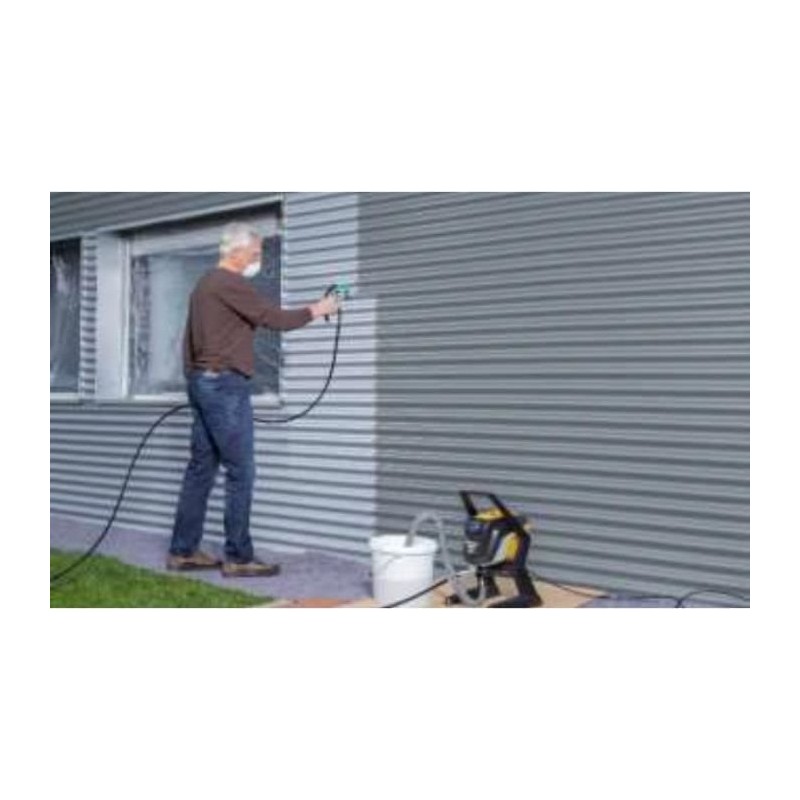 Airless-Kolbenpumpe für mittlere und sehr große Projekte – Ausgestattet mit innovativer, leistungsstarker Airless-Technologie – Ausgestattet mit der Flüssigmaterialdüse Pro 311, der Wanddüse Pro 517, dem HEA-Filterset und einer Hybrid-Spritzpistole – Materialdurchfluss 1,5 l/min - Druck: 110 bar - Leistung: 600 W - Schlauchlänge: 15 m.