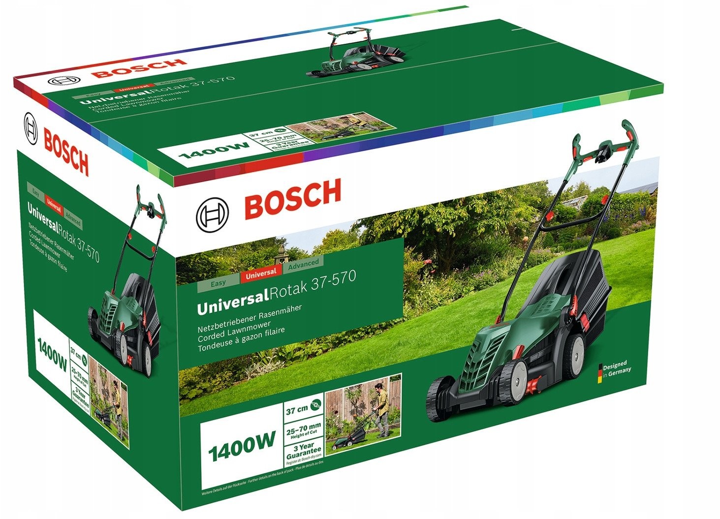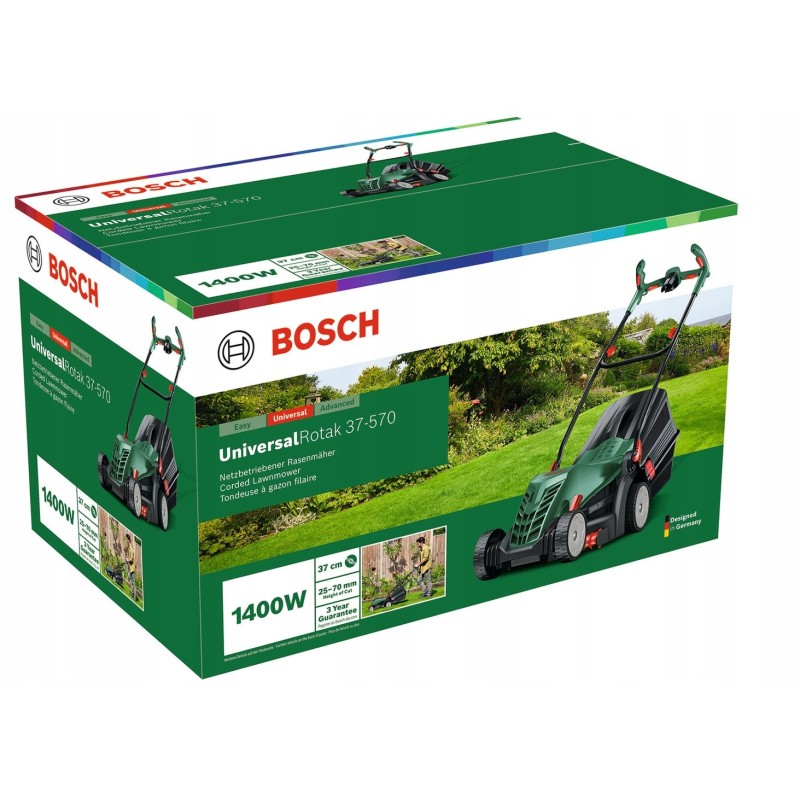 Der Elektrorasenmäher Bosch UniversalRotak 37-570 ist eine hervorragende Wahl für Besitzer mittlerer und größerer Gärten. Dank seines 1400-W-Motors bewältigt das Gerät mühelos dichtes Gras und sorgt für ein effizientes und schnelles Mähen. Mit einer Schnittbreite von 37 cm eignet er sich ideal für vielfältige Rasenflächen und ist somit ein vielseitiges Werkzeug für die Gartenpflege.