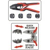 Das Set besteht aus einer Zange mit automatischem, einstellbarem Ratschenmechanismus sowie aus austauschbaren Matrizen, die auf fünf Arten von elektrotechnischen Steckverbindern abgestimmt sind. Der Austausch der Matrizen erfolgt über einen Schnellwechselhebel.