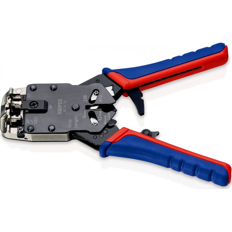 • Crimpbereich: RJ 10 (4-polig) 7,65 mm, RJ 11/12 (6-polig) 9,65 mm, RJ 45 (8-polig) 11,68 mm.