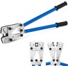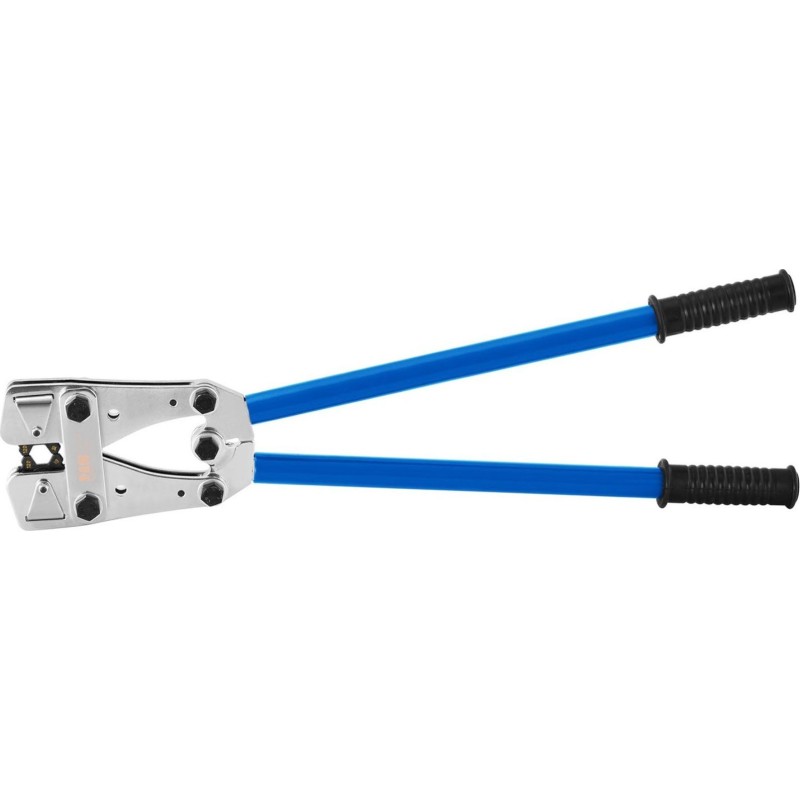 Die Crimpzange der Marke MSW ermöglicht die Bearbeitung von Kupfer- und Aluminiumhülsen zur Verbindung elektrischer Leitungen. Der Crimpbereich beträgt 6–120 mm . Die Konstruktion der Presse, einschließlich der sechseckigen Matrize, besteht aus 400 Cr-Stahl und zeichnet sich durch eine Härte von 42–45 HRC aus. Um zwei Leitungen dauerhaft zu verbinden, genügt es, die Schutzschicht von den Kabeln zu entfernen, eine Hülse in der passenden Größe auf die Ader aufzustecken und diese mit der Zange zu crimpen. Die sechseckige Matrize klemmt die Verbindung gleichmäßig von allen Seiten. Rutschfeste Auflagen an den Griffen sorgen für einen sicheren Halt des Werkzeugs.