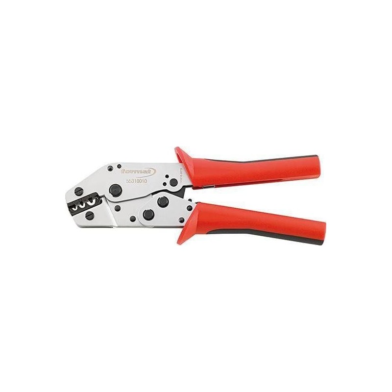 Ausführung: Zange aus Stahl. Der Verriegelungsmechanismus sorgt für präzises und gleichmäßiges Crimpen. Die Verriegelung kann bei eventuellen Fehlern gelöst werden. Kunststoffbeschichtete Griffe. Drei Crimpstationen.
