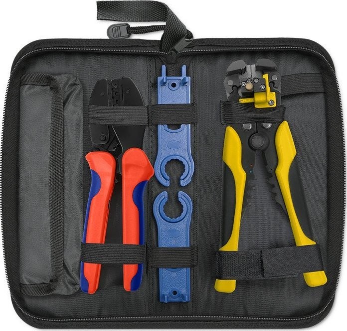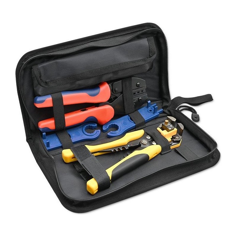 Die praktische Aufbewahrungstasche für Solarwerkzeuge erleichtert Ihnen den Transport der Werkzeuge während der Montage der Solaranlage und schützt sie vor versehentlichem Verlust und mechanischen Beschädigungen. Alle Werkzeuge sind mit MC4-Steckverbindern kompatibel, sodass Sie alle Arbeiten im Zusammenhang mit der Montage von Solarsteckverbindern und dem Anschluss von Kabeln an die Photovoltaikanlage ausführen können. Schon jetzt können Sie mühelos die Isolierung von Kabeln abisolieren oder Kabel und Leitungen mit unterschiedlichen Durchmessern durchtrennen.