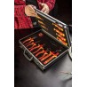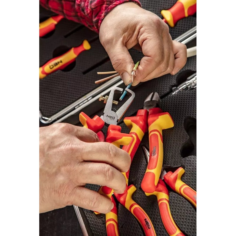 Das 1000-V-Werkzeugset NEO (Art.-Nr. 01-234) enthält 13 Teile, darunter Schraubendreher und Zangen. Zugelassen für Arbeiten unter Spannung bis 1000 V. Die Schraubendreherklingen bestehen aus besonders widerstandsfähigem Chrom-Molybdän-Stahl. Die Backen der Zangen sind aus Chrom-Vanadium-Stahl geschmiedet. Zweikomponenten-Ergogriffe erhöhen den Arbeitskomfort. Die Zuverlässigkeit des Produkts wird durch eine 25-jährige Garantie bestätigt. Die Marke NEO erfüllt die Erwartungen von Profis.