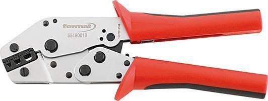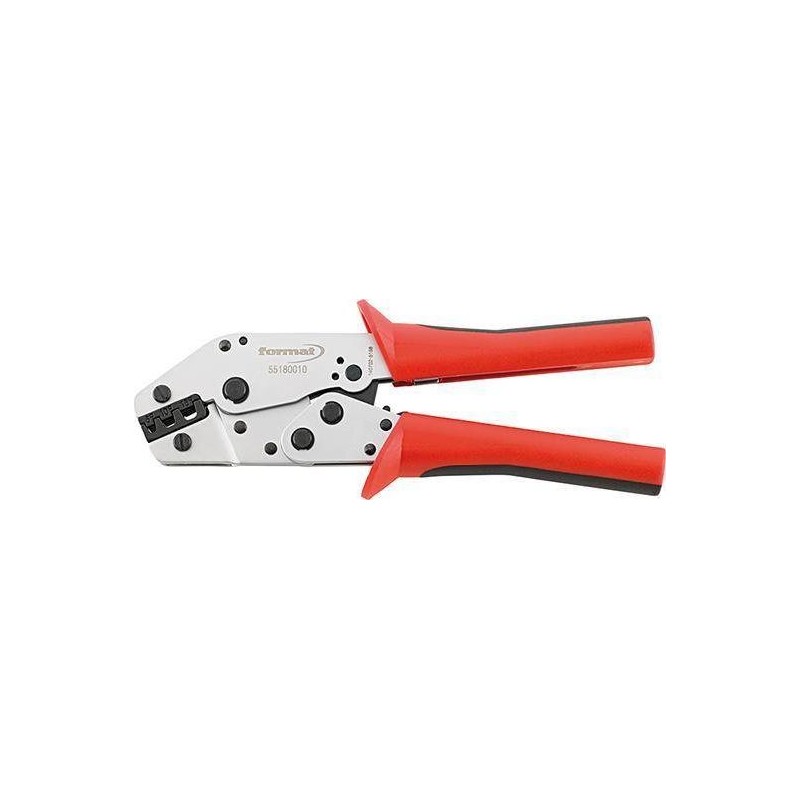Ausführung: Zange aus Stahl. Der Verriegelungsmechanismus sorgt für präzises und gleichmäßiges Crimpen. Die Verriegelung kann bei eventuellen Fehlern gelöst werden. Kunststoffbeschichtete Griffe. Drei Crimpstellen.