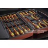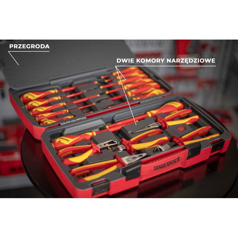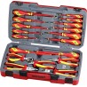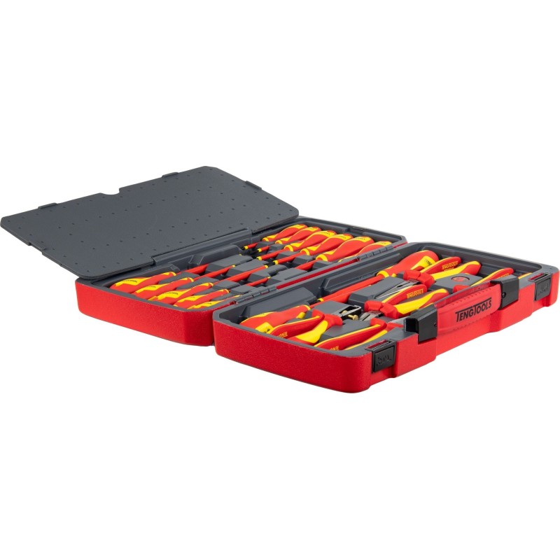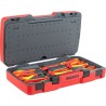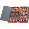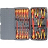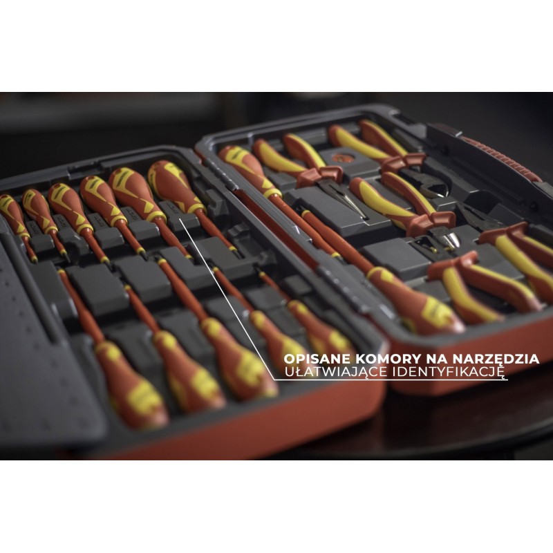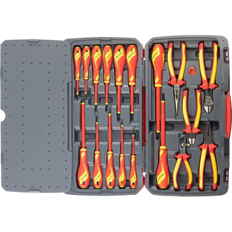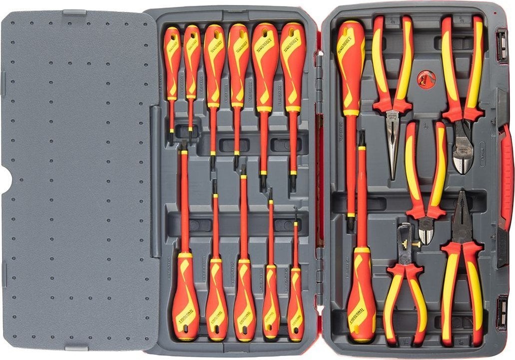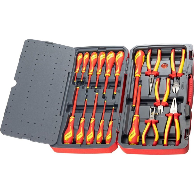 Set bestehend aus 18 Teilen. Enthält 13 Schraubendreher und 5 Zangen, hergestellt gemäß der Norm IEC 60900, für Arbeiten unter Spannung bis 1000 V (durch speziell geschultes Personal). Lieferung in einer Kunststoffbox mit Metallverschluss, klappbarem Griff und Scharnier mit Metallachse. An der Unterseite der Box befinden sich rutschfeste Gummifüße.