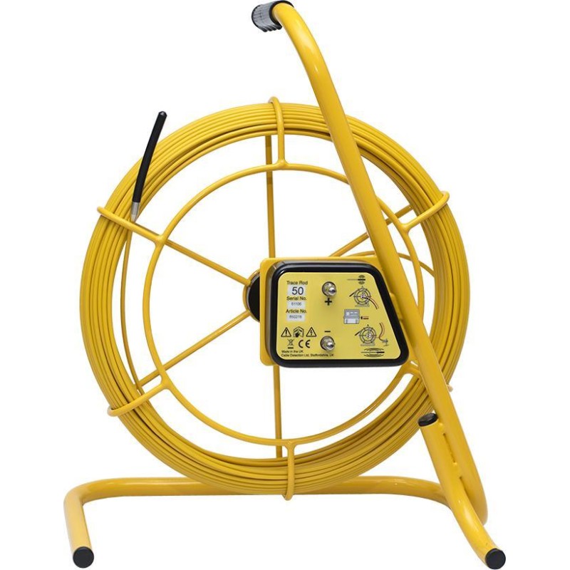 Das Ortungskabel EziRod 50 der Schweizer Firma GeoMax ermöglicht die Ortung von Rohren und Kabeln mit kleinem Durchmesser, die keine elektrischen Signale leiten. Es kann sowohl im Linearmodus als auch im Sondiermodus verwendet werden. a) Kabelspitze. Sondenmodus – dient zur genauen Bestimmung des Endes des Ortungskabels. b) Ortungskabel. Linearmodus – flexibel, mit Glasfaser ummantelt. Im Inneren befinden sich signalführende Kupferkabel. c) Anschlussbuchsen. Dienen zum Anschluss des Signalgenerators. d) Gestell. Dient zum Aufwickeln des flexiblen Kabels. Kann sowohl vertikal (wie in der Abbildung) als auch horizontal verwendet werden. Ist Teil des kompletten Sets des EZISYSTEM-Detektors für unterirdische Leitungen. Fragen Sie nach weiteren Informationen unter Tel. 56 306 61 00