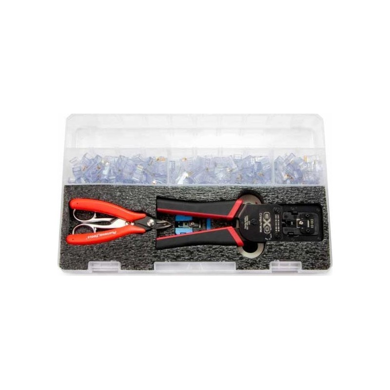 Das Set enthält Werkzeuge wie die EXO-Crimpzange mit ezEX-RJ45- und EZ-RJ45-Einsätzen, eine Elektrikerschere, einen Cyclops-Kabelschneider, eine 5-Zoll-Seitenschneidezange sowie 125 Steckverbinder verschiedener Typen.