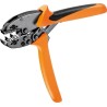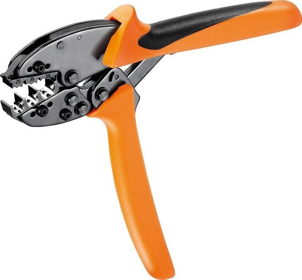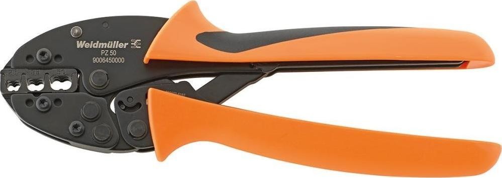 Crimpzange PZ 50 Ausführung: Zangenkörper aus Stahl, mit Zwangsverriegelung für korrektes und vollständiges Crimpen. Entriegelungsmöglichkeit bei eventuellen Bedienungsfehlern. Griffe mit Mehrkomponenten-Kunststoffummantelung. Anwendung: zum Crimpen von Kabelhülsen nach DIN 46228 (Teil 1 + 4), mit und ohne Kunststoffflansch. Trapez-Crimpzange. Mit seitlicher Beladung.