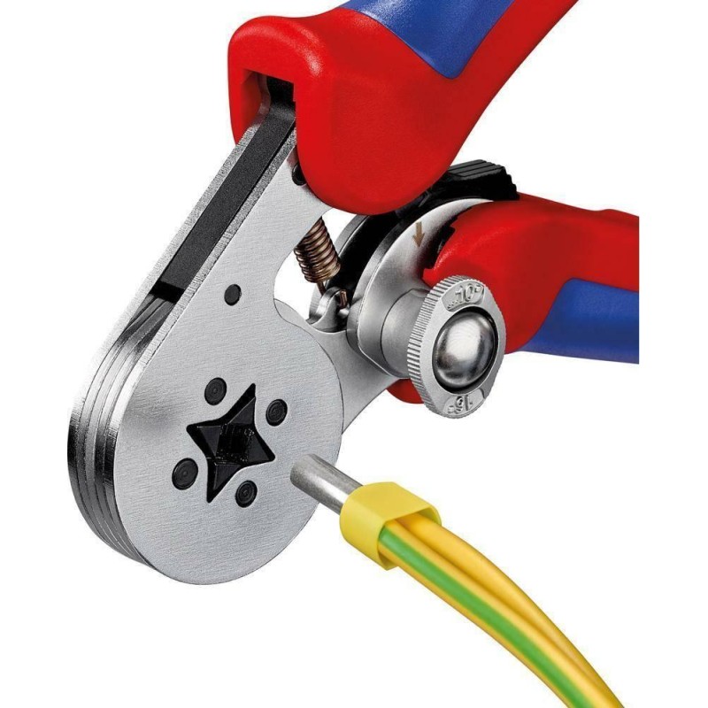 Zange zum Crimpen von Kabelhülsen Ausführung: aus Chrom-Vanadium-Elektrostahl, geschmiedet, ölgehärtet und angelassen. Um dank präziser Profile und einer zwangsgeführten, lösbaren Arretierung optimale Crimp-Ergebnisse zu erzielen, ist die Klemmkraft werkseitig voreingestellt. Kraftverstärkung durch Hebelübersetzung, Griffe mit Mehrkomponenten-Kunststoffbeschichtung. Seitliche Beladung. Mit einer Klemmbuchse. Anwendung: zum Crimpen von Kabelmuffen nach DIN 46228 (Teil 1 + 4) mit Kunststoffflansch. Kopf verchromt. Vierkantklemmung.