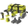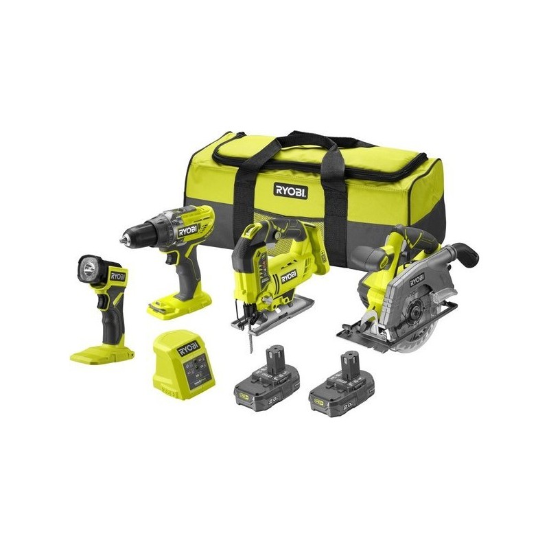 Das Akku-Set RYOBI ONE+ RCK184D-220S besteht aus einer Akku-Bohrmaschine ONE+ R18DD3, einer Akku-Stichsäge ONE+ R18JS, einer Akku-Kreissäge, einer kabellosen LED-Handtaschenlampe RLF18, zwei ONE+-Akkus und einem Ladegerät. Das Set wird in einer geräumigen RYOBI-Werkzeugtasche geliefert.