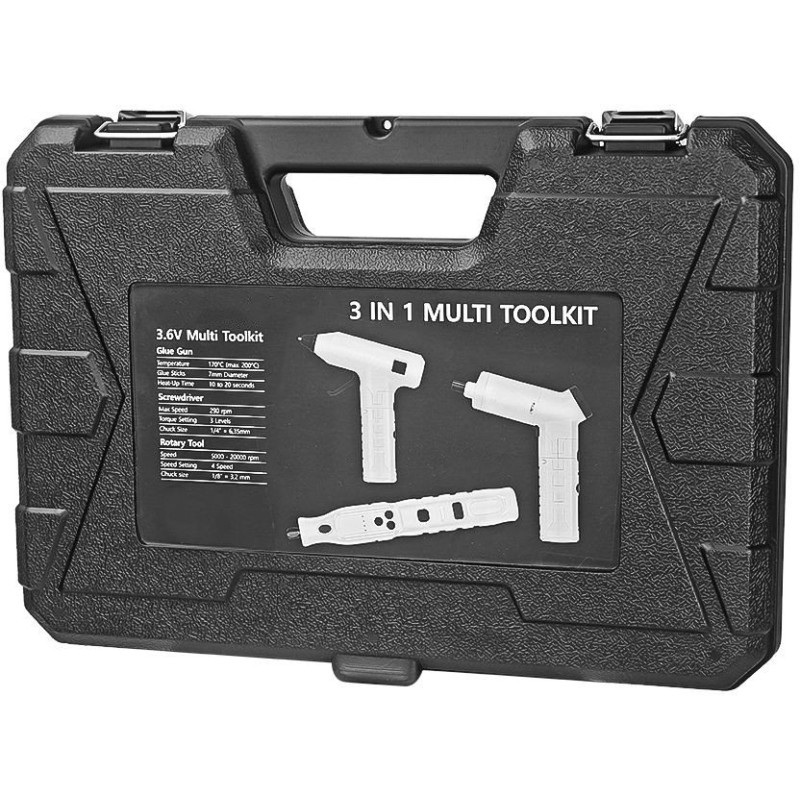 Das Set enthält drei unverzichtbare Werkzeuge, die sich hervorragend für verschiedene Projekte eignen. Der Elektroschrauber mit einer Drehzahl von 290 U/min und einstellbarem Drehmoment (1,5 / 3 / 5 N) ermöglicht präzises Schrauben. Der Mini-Schleifer/Fräser mit Drehzahlen von 5000, 10000, 15000 und 20000 U/min ermöglicht vielfältige Anwendungen, und die Klebepistole, die sich in 15 Sekunden auf 170 °C aufheizt, erleichtert schnelles und effektives Kleben.