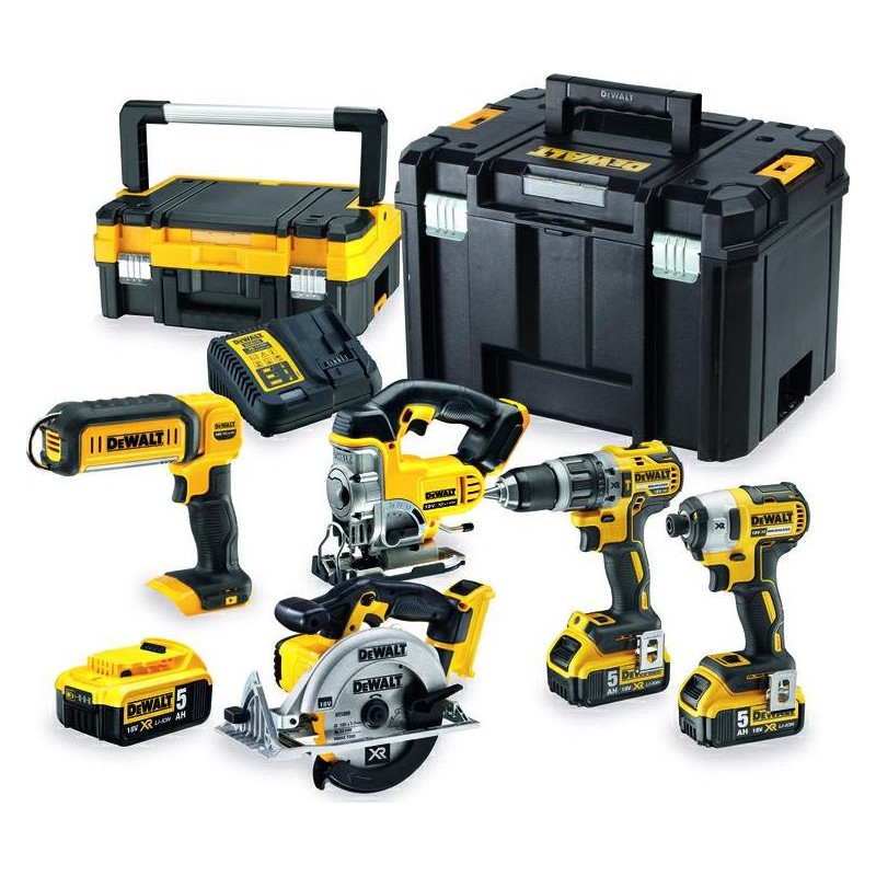 Das Akku-Werkzeugset DCK551P3T von DeWALT enthält zwei Maschinen für Montagearbeiten, zwei Schneidwerkzeuge sowie eine Arbeitsleuchte. Der Bohrschrauber kann dank seiner Schlagfunktion auch Löcher in leichte Baumaterialien bohren. Der Schrauber mit drei Drehzahlstufen eignet sich zum schnellen Eindrehen kleiner Schrauben und Bolzen sowie zum Verbinden mit den größten Schrauben und zum Lösen großer Muttern. Die Kreissäge ermöglicht präzises und schnelles Schneiden von Holz entlang und quer zur Maserung. Die Stichsäge hingegen ermöglicht Kurvenschnitte und, mit dem entsprechenden Zubehör, die Bearbeitung jedes Materials. Das Combo-Set verfügt über drei 18-V-Akkus der XR-Serie mit einer Kapazität von 5,0 Ah. Alle Maschinen, ihr Zubehör, das Ladegerät und die Akkus werden in zwei Systemkoffern geliefert. Das kleinere Modell kann als Aufbewahrungskoffer für den Akkuschrauber und den Schlagschrauber dienen. Sein Organizer bietet Platz für zahlreiche Bohrer, Bits, Schrauben und andere Kleinigkeiten. Der große Koffer ist für die Kettensäge und die Stichsäge sowie andere größere Werkzeuge vorgesehen.