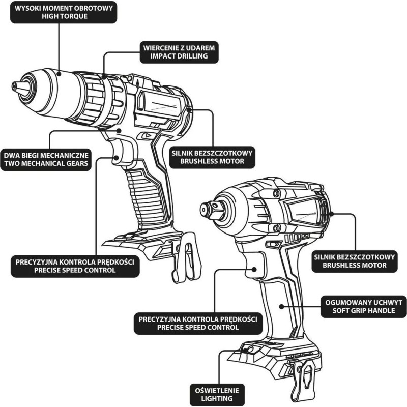 Das Set enthält außerdem einen modernen Akku-Bohrschrauber mit Schlagfunktion, der mit einem bürstenlosen Motor ausgestattet ist. Er zeichnet sich durch hohe Leistung, lange Lebensdauer und die Möglichkeit aus, mit einer einzigen Akkuladung über einen längeren Zeitraum zu arbeiten.