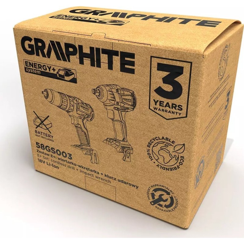 Ein Elektrowerkzeugset der Marke GRAPHITE, das mit dem modernen Energy+-Akkusystem betrieben wird. Es enthält einen bürstenlosen Schlagschrauber, der mit einem 18-V-Lithium-Ionen-Akku kompatibel ist (nicht im Set enthalten). Er zeichnet sich durch einen bürstenlosen, robusten Motor und eine hohe Drehzahl von bis zu 3780 Umdrehungen pro Minute aus. Das Drehmoment erreicht nacheinander 80, 120 und 300 Nm. Ausgestattet mit einem ½-Zoll-Vierkant-Werkzeugaufnahme ermöglicht er die Aufnahme der gängigsten Arten von Schlagschraubendreher-Einsätzen.